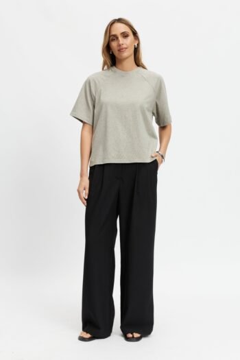 The relaxed, loose fit silhouette features drop shoulder armholes for a laid-back look, while the mock neckline adds a touch of modern elegance.