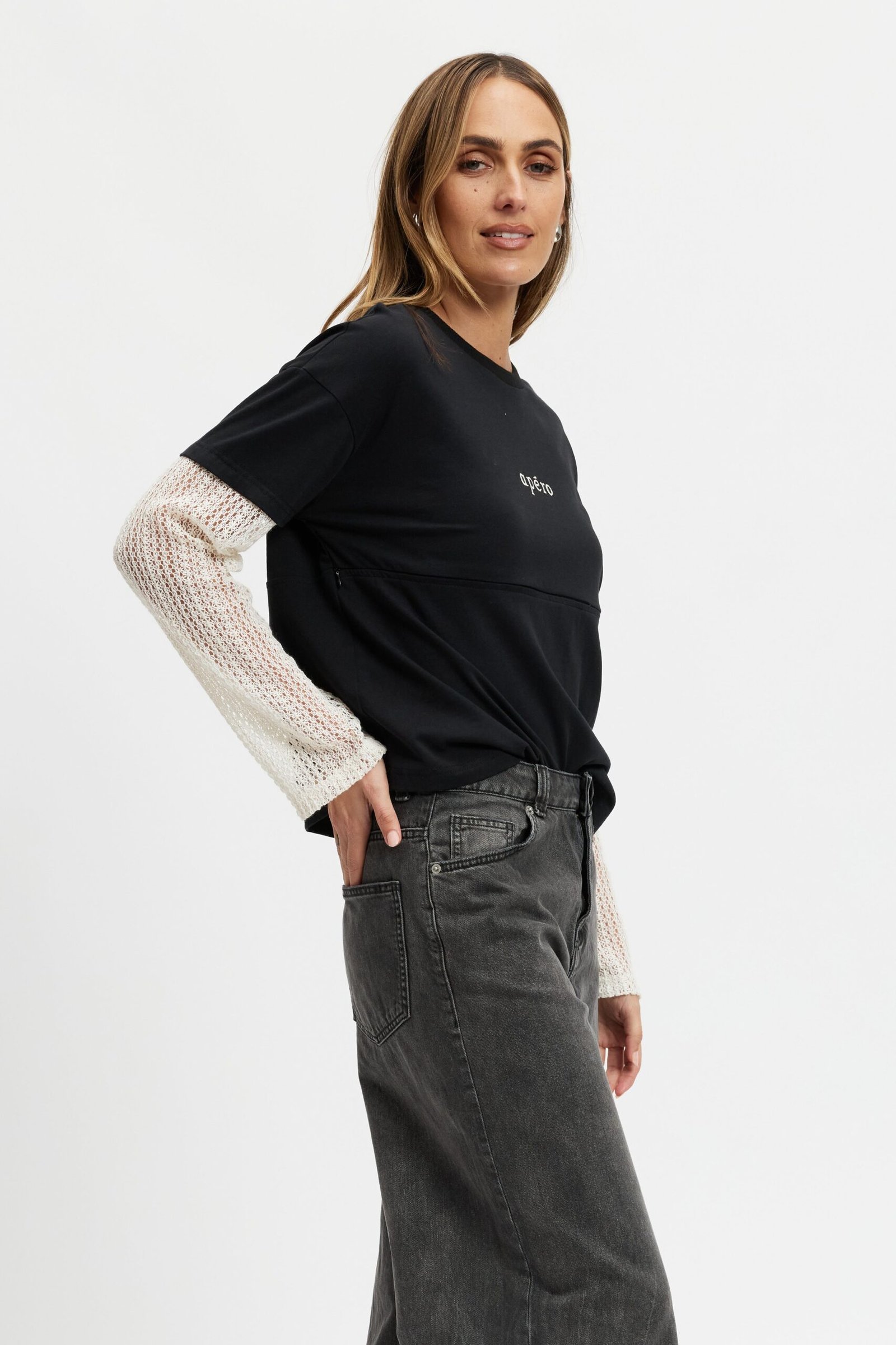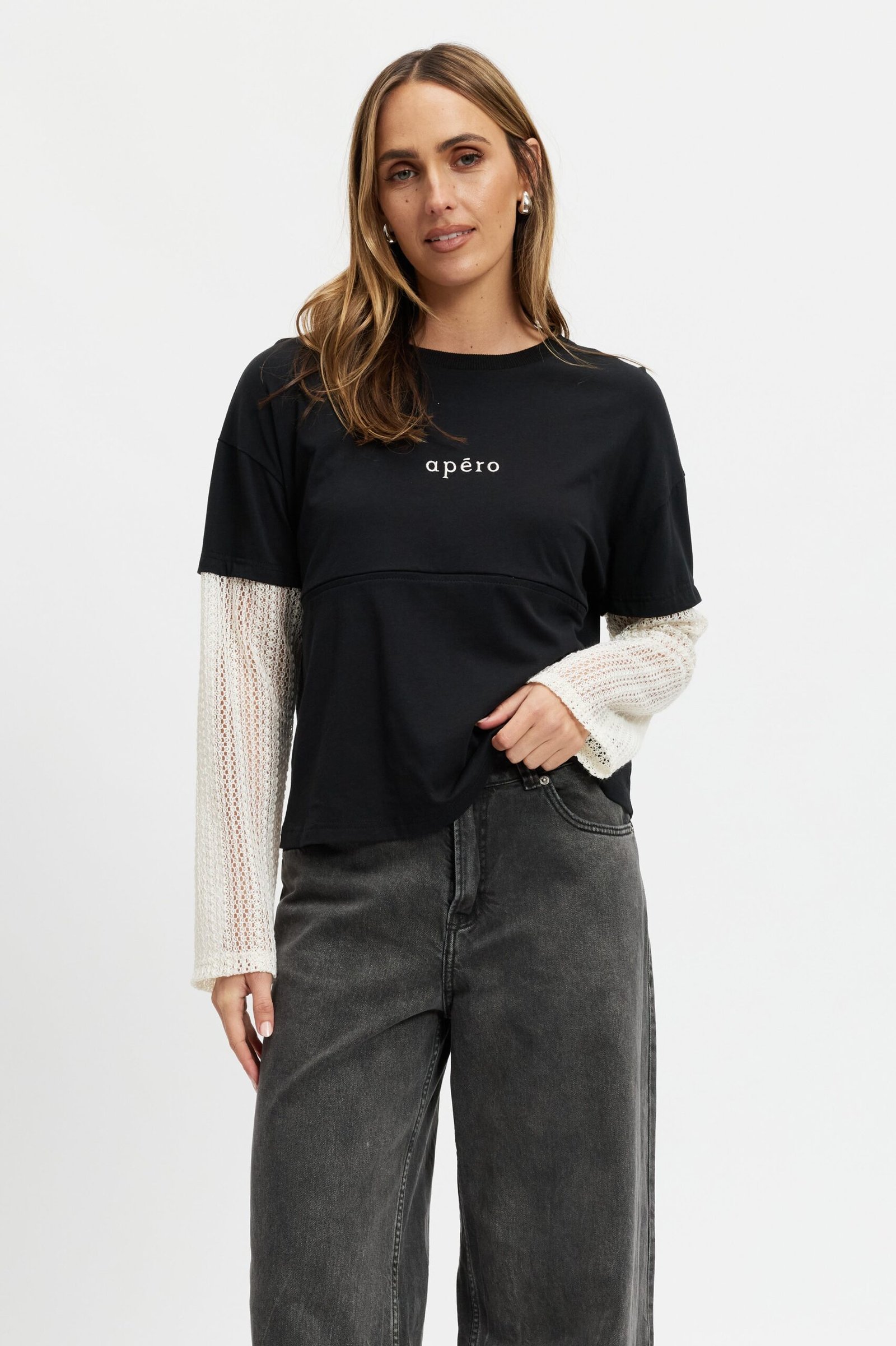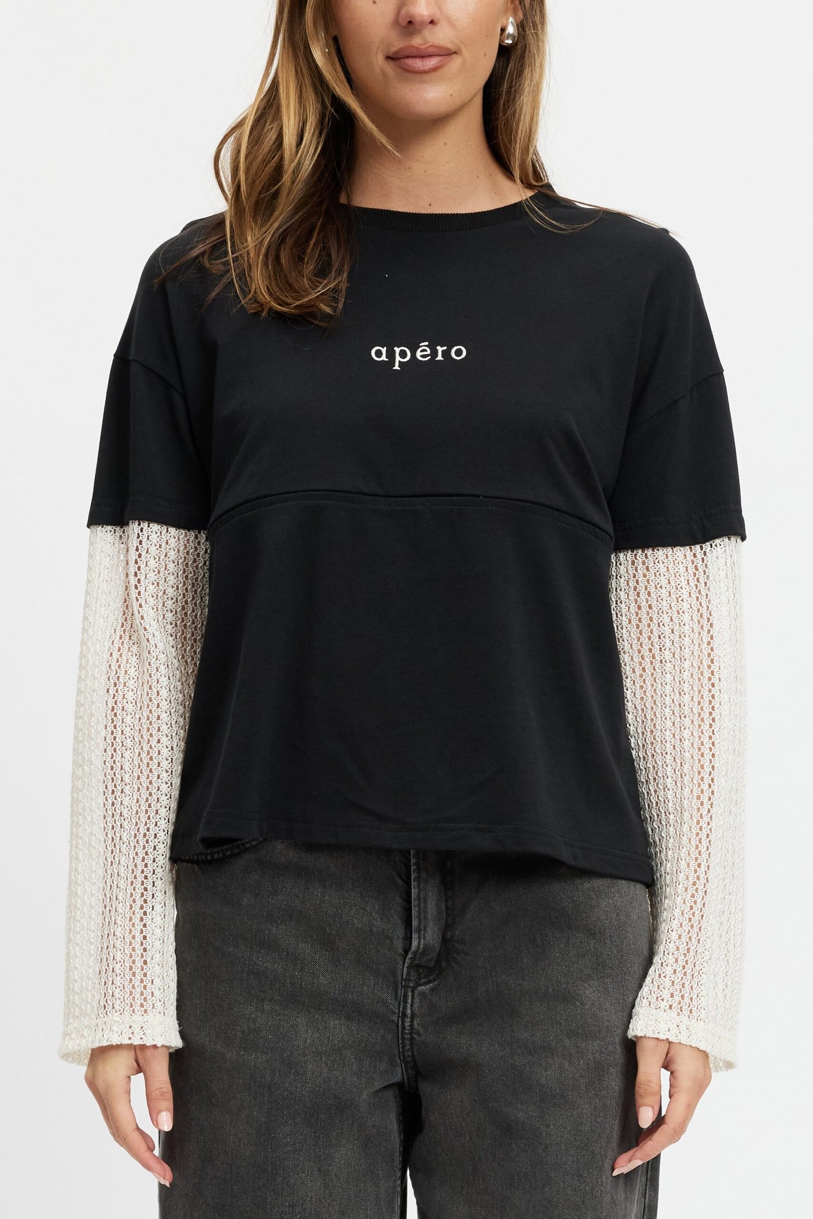 Blending comfort with trend-driven detail, the Carson features a soft black cotton jersey body paired with cream crochet lace sleeves that attach seamlessly at the tee sleeve hem, creating a modern layered look. A drop-shoulder silhouette and relaxed fit offer an effortless vibe, while a small cream Apéro embroidery at the chest adds a refined touch.