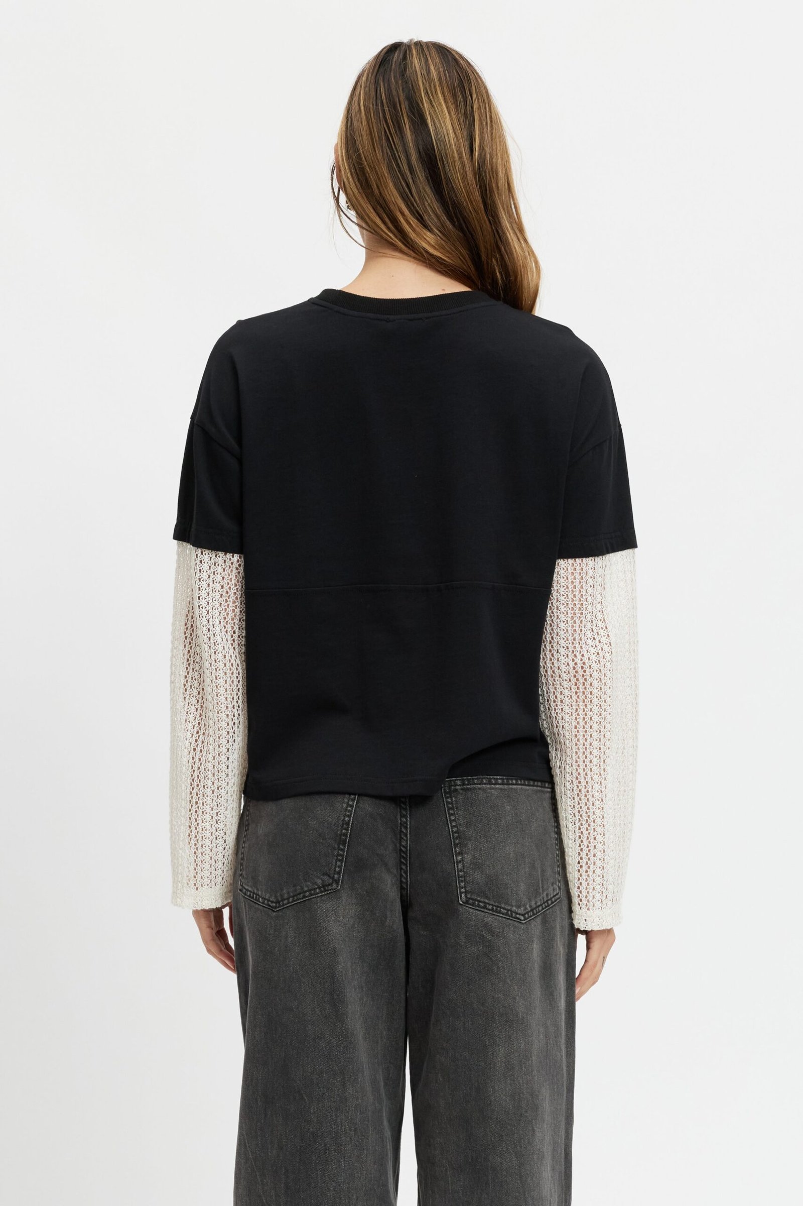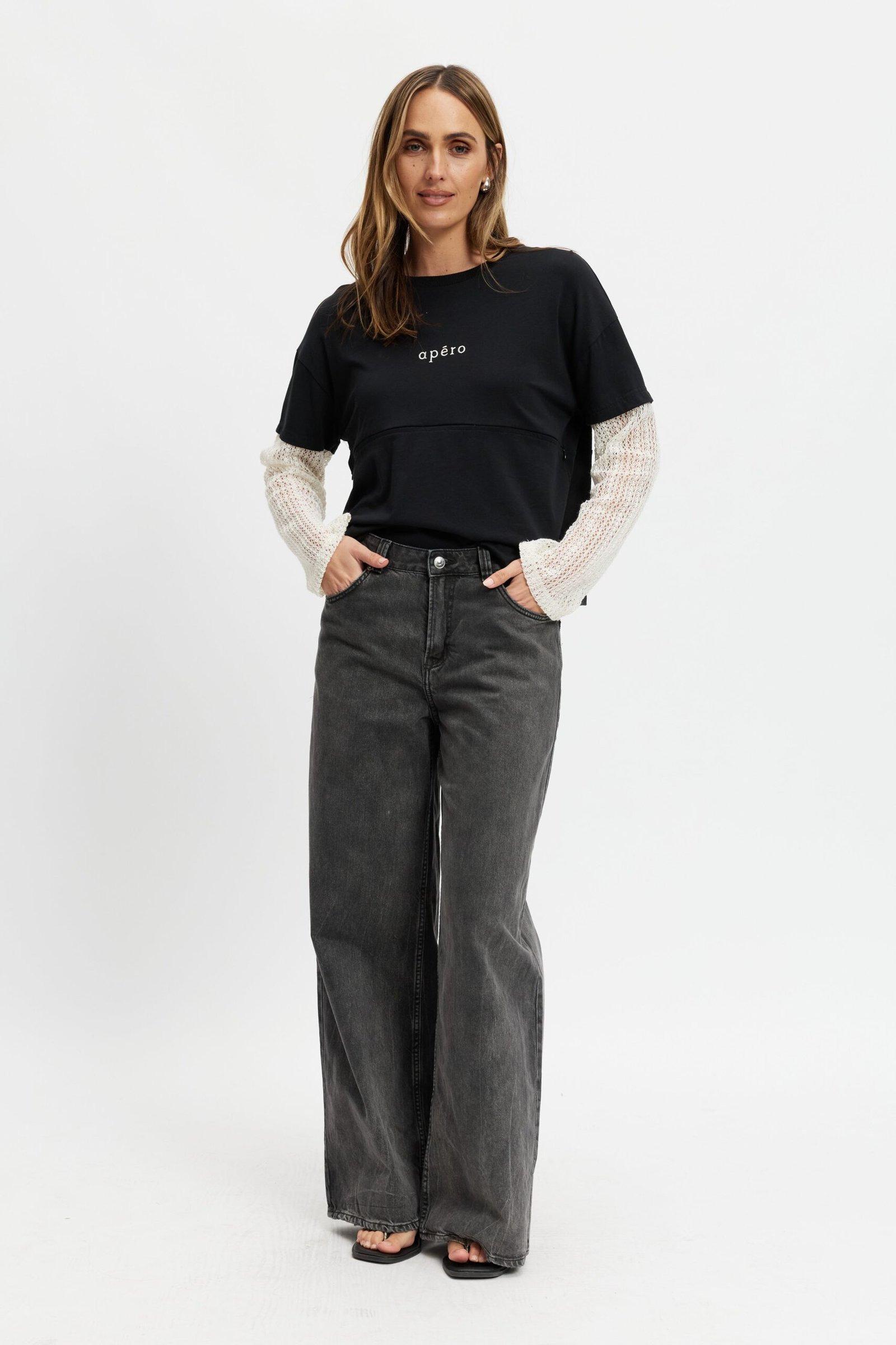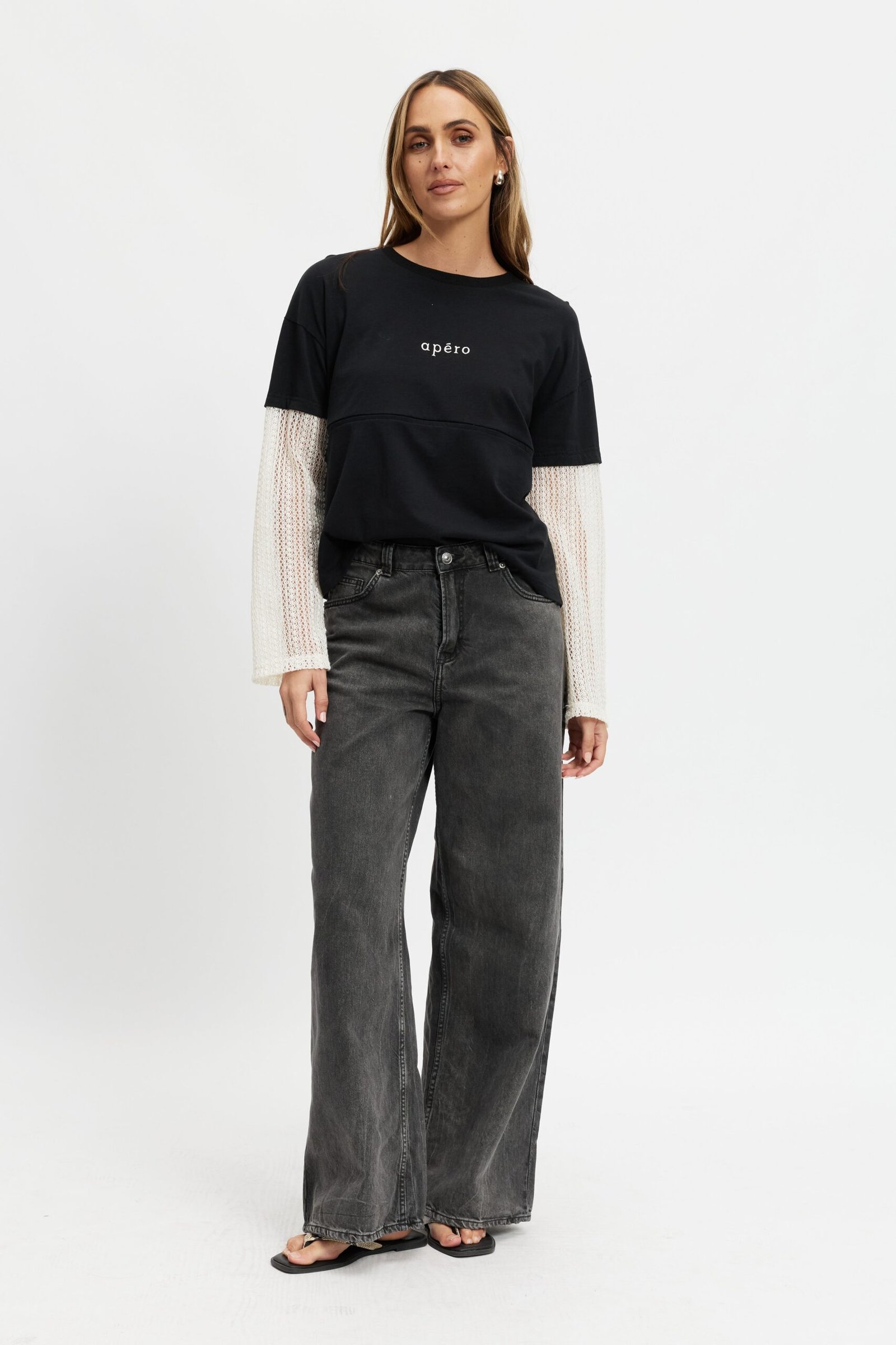 Blending comfort with trend-driven detail, the Carson features a soft black cotton jersey body paired with cream crochet lace sleeves that attach seamlessly at the tee sleeve hem, creating a modern layered look. A drop-shoulder silhouette and relaxed fit offer an effortless vibe, while a small cream Apéro embroidery at the chest adds a refined touch.