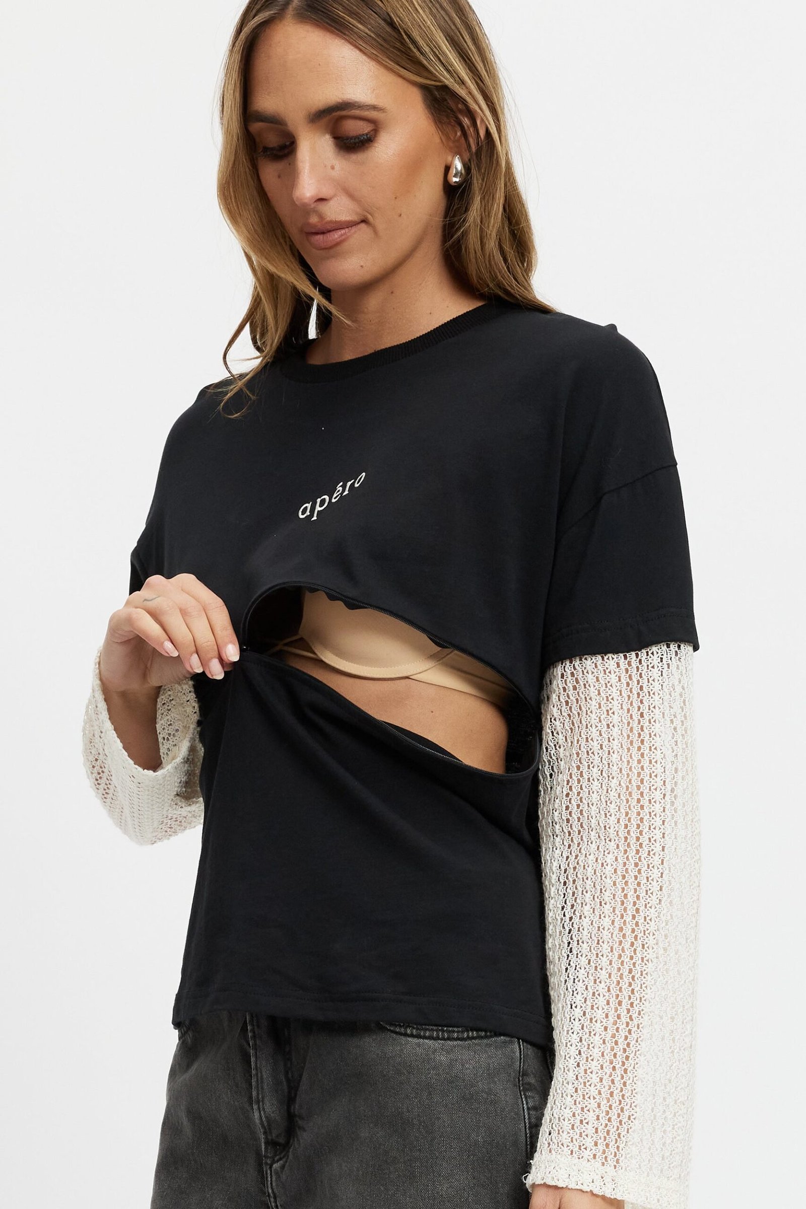 The Carson Layered Long Sleeve Tee in Black / Cream brings a fresh take on everyday style with subtle functionality built in for motherhood. Featuring a discreet two-way zipper hidden in the front underbust seam, this top makes breastfeeding easy without compromising on design.