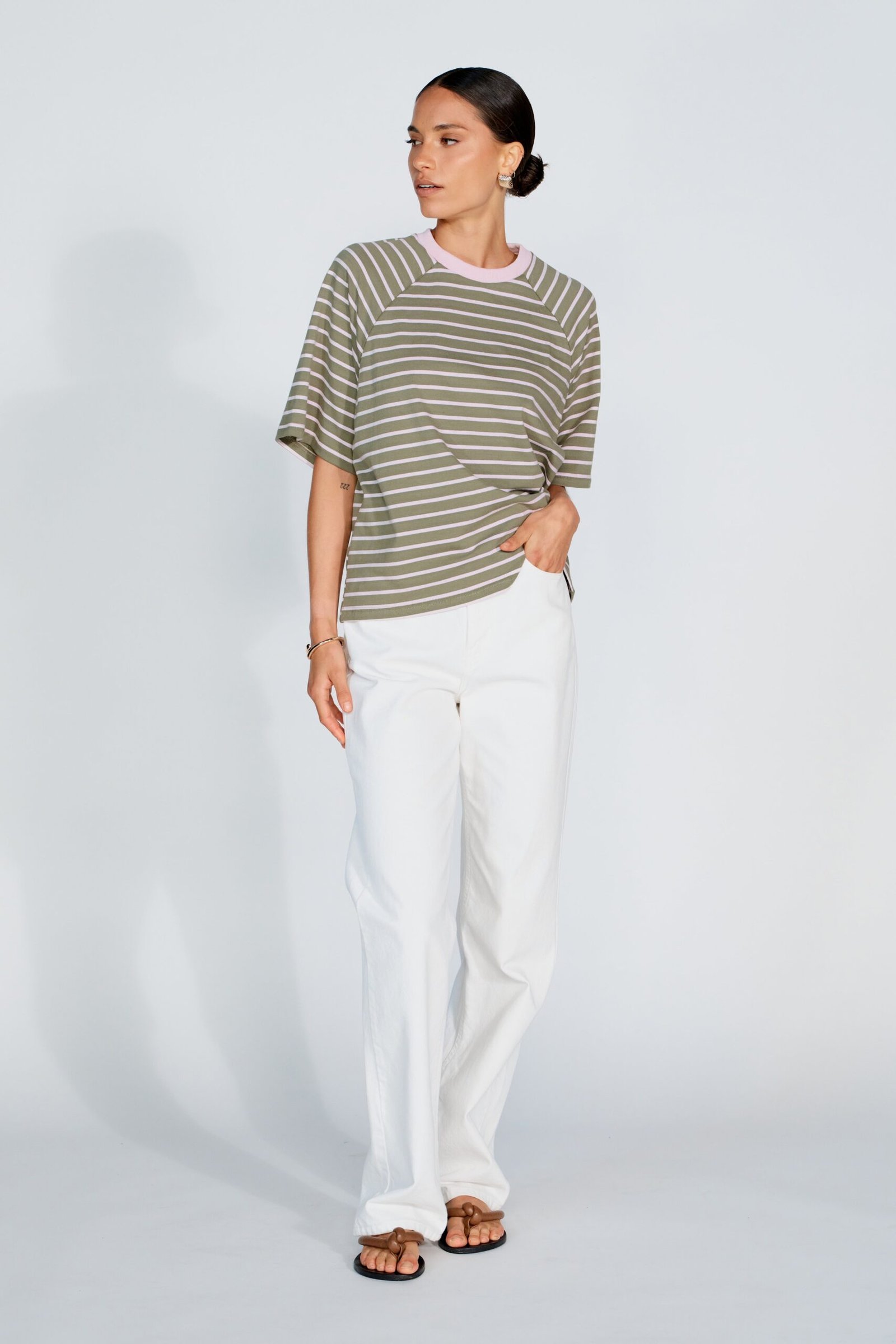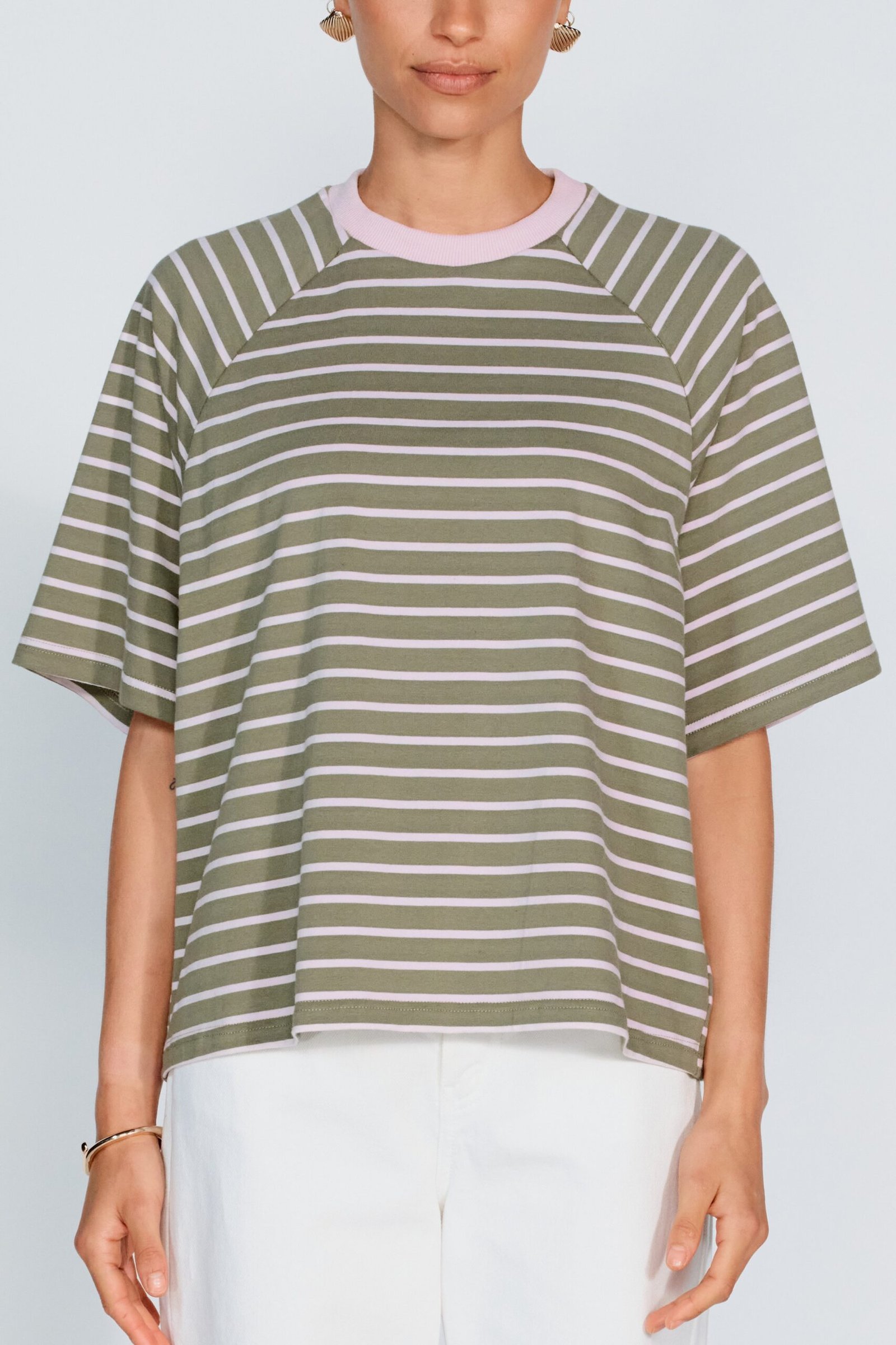 Introducing the Classique Stripe Box-Cut Tee – Khaki / Pink to your wardrobe rotation.