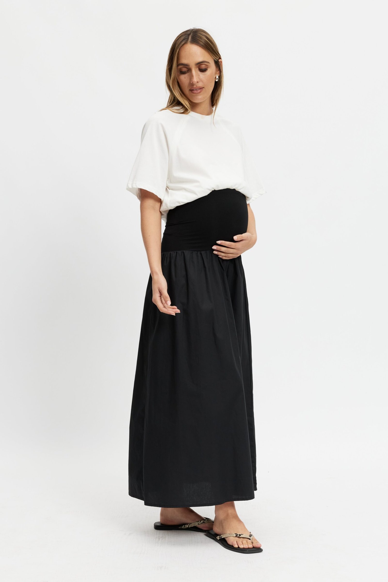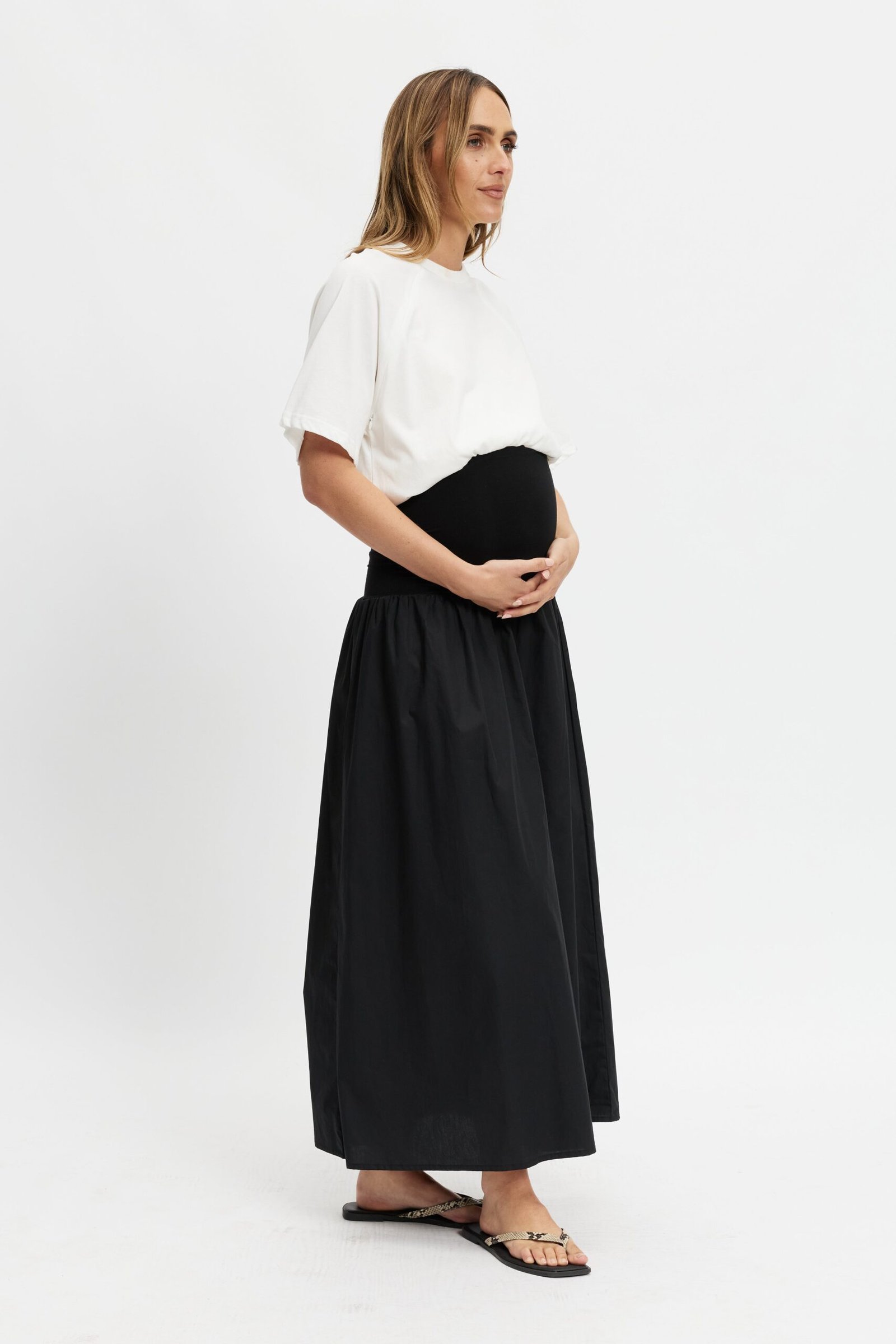 The Emmy Drop-Waist Jersey Poplin Midi Skirt in Black is a modern wardrobe staple designed with motherhood in mind. Featuring a super stretchy, buttery-soft jersey waistband, it offers a comfortable, supportive fit over the bump and can be folded down post-pregnancy for a lower waistline option.