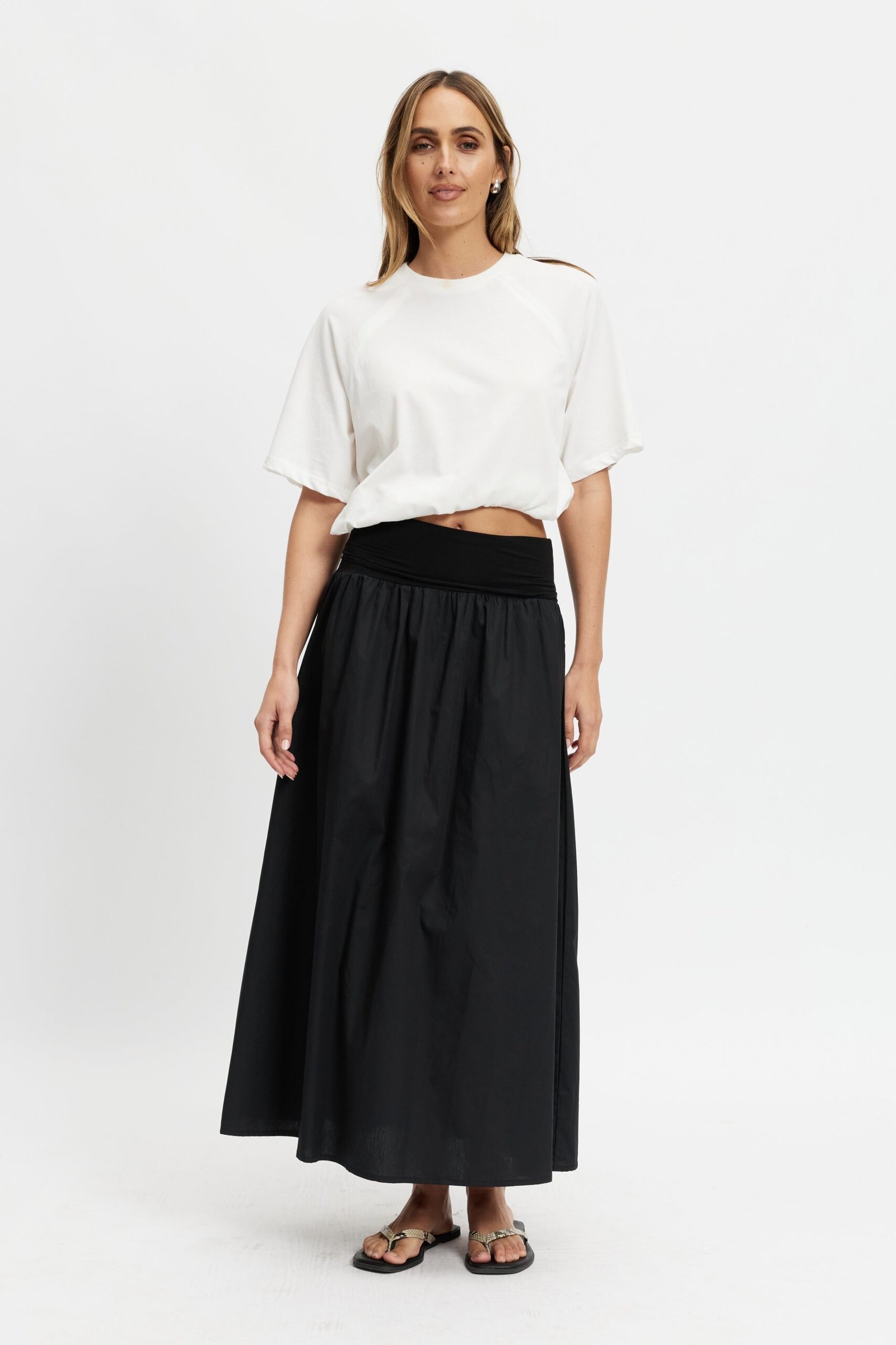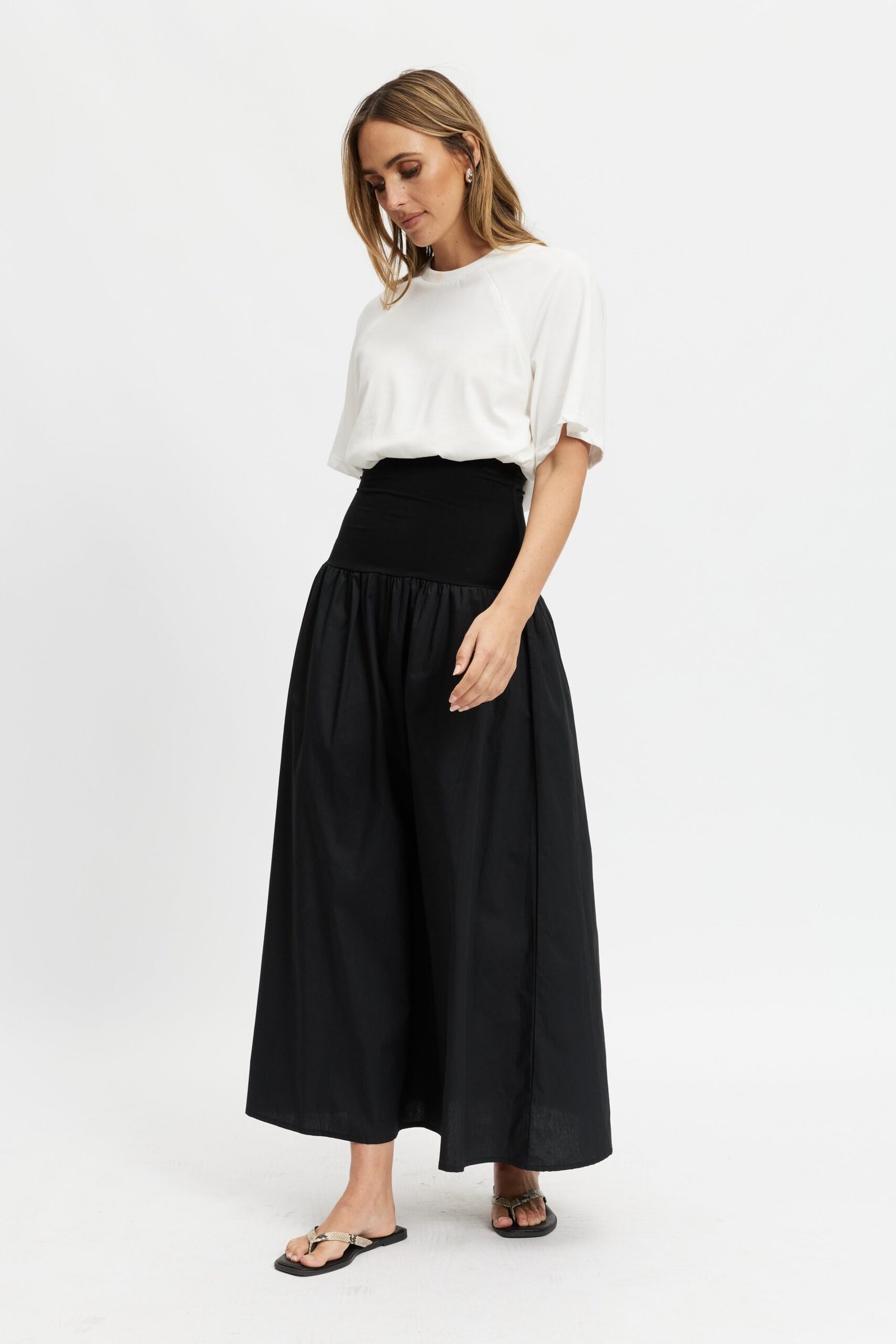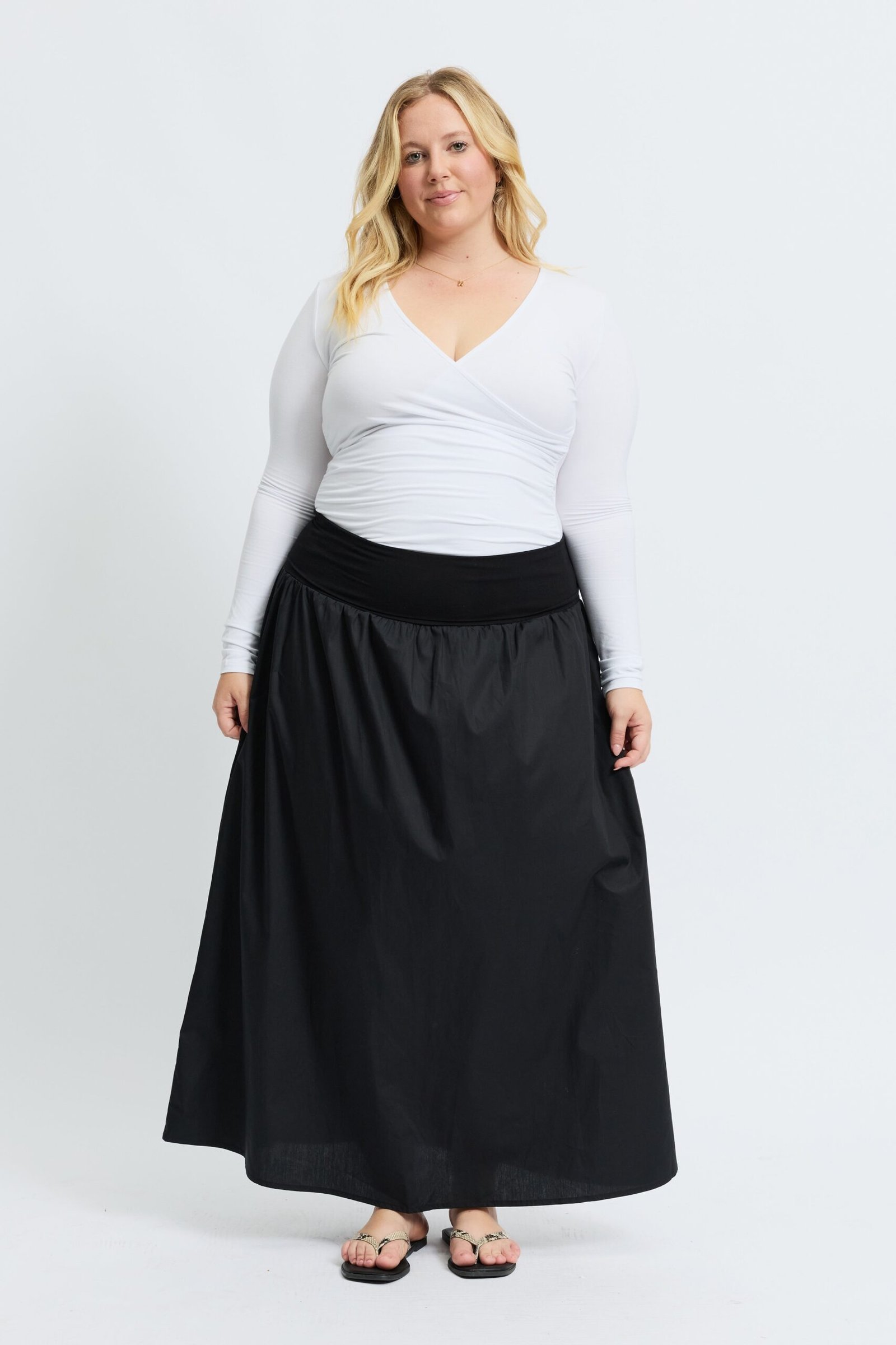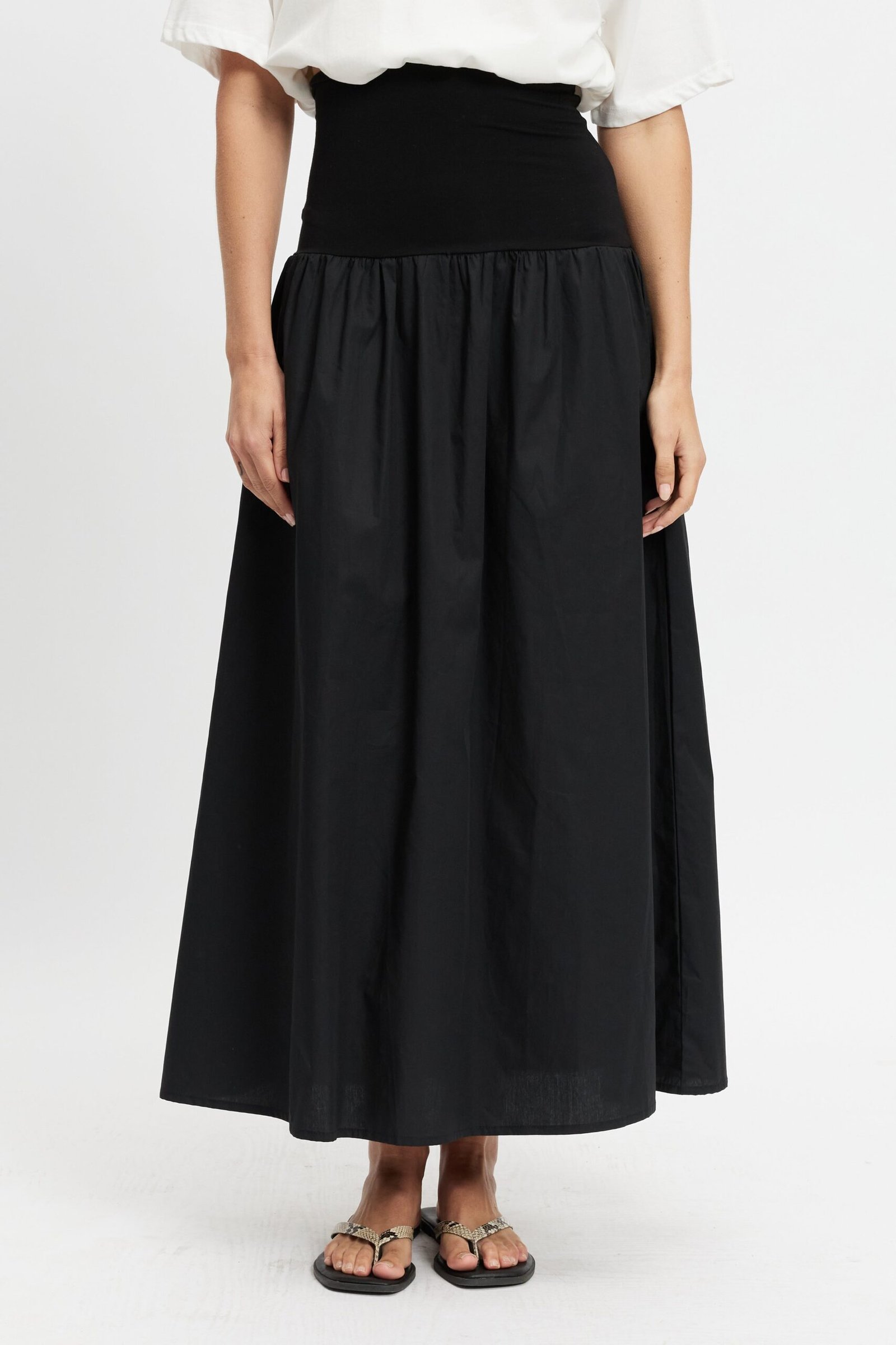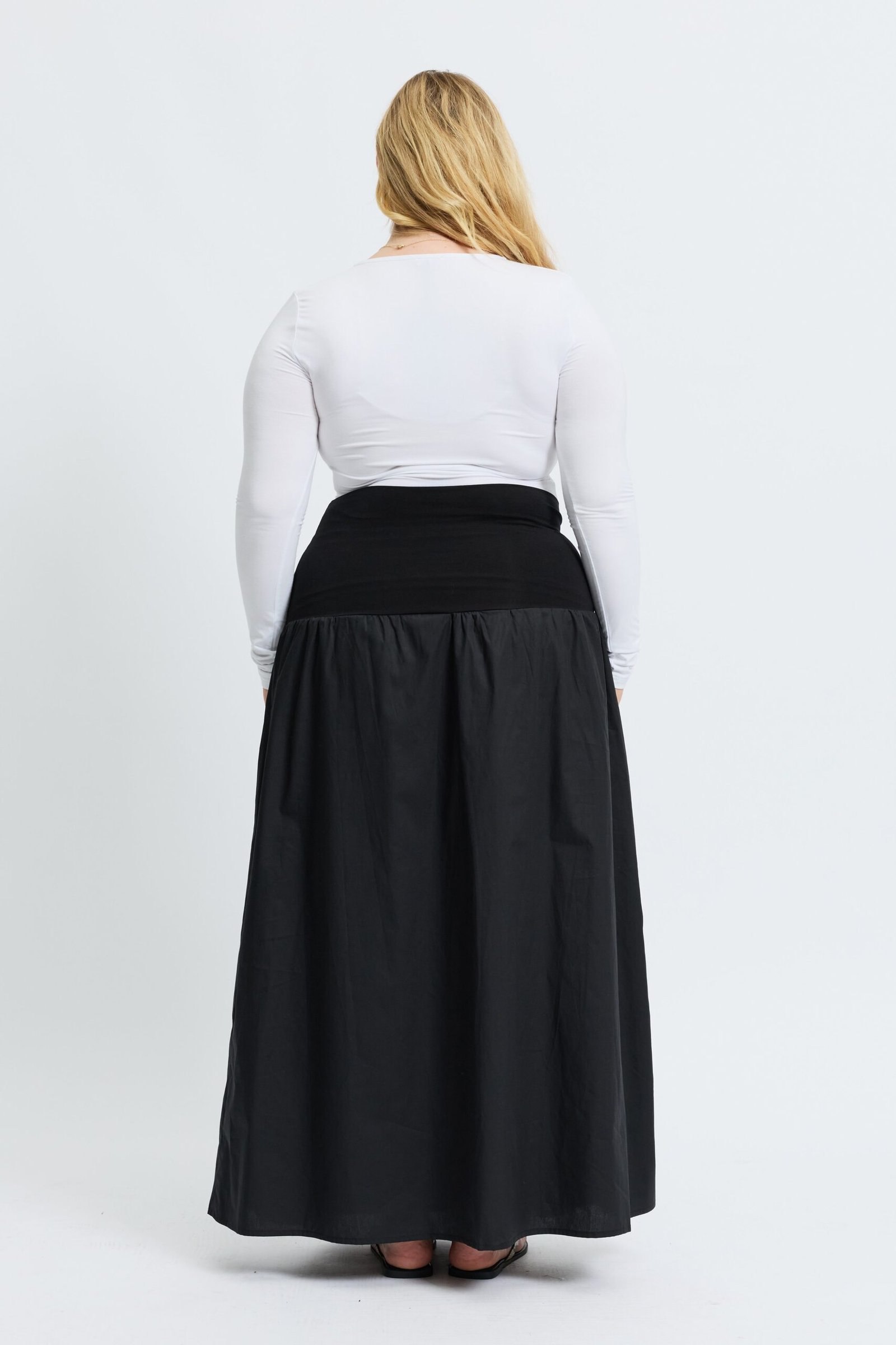 In classic black, this long midi skirt balances structure and softness with a fitted waistband from underbust to hip, flowing into a full, gathered drop-waist skirt made from crisp cotton poplin. The contrast in textures creates a flattering silhouette that’s both elevated and easy to wear.
