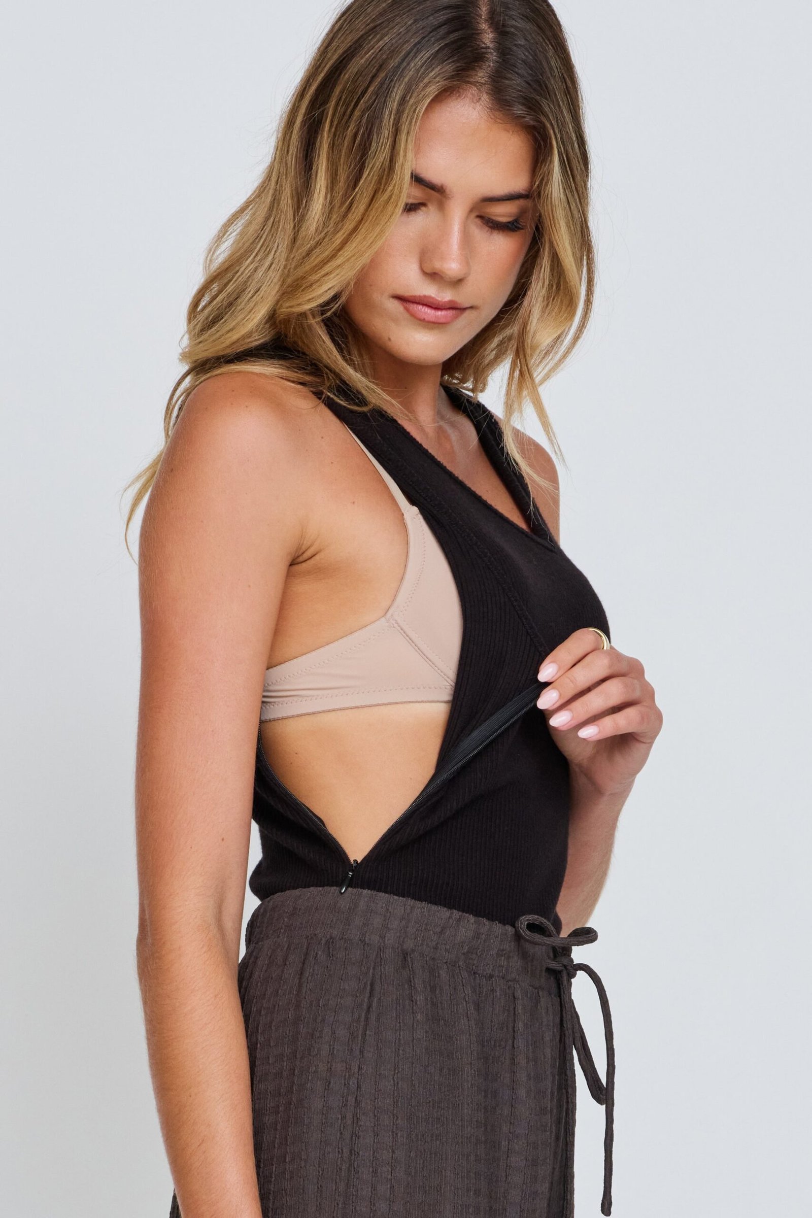 Designed with invisible side zippers for discreet breastfeeding access, this tank combines functionality with fashion. Its unique asymmetrical neckline adds a unique touch, and the reversible design offers endless styling possibilities.