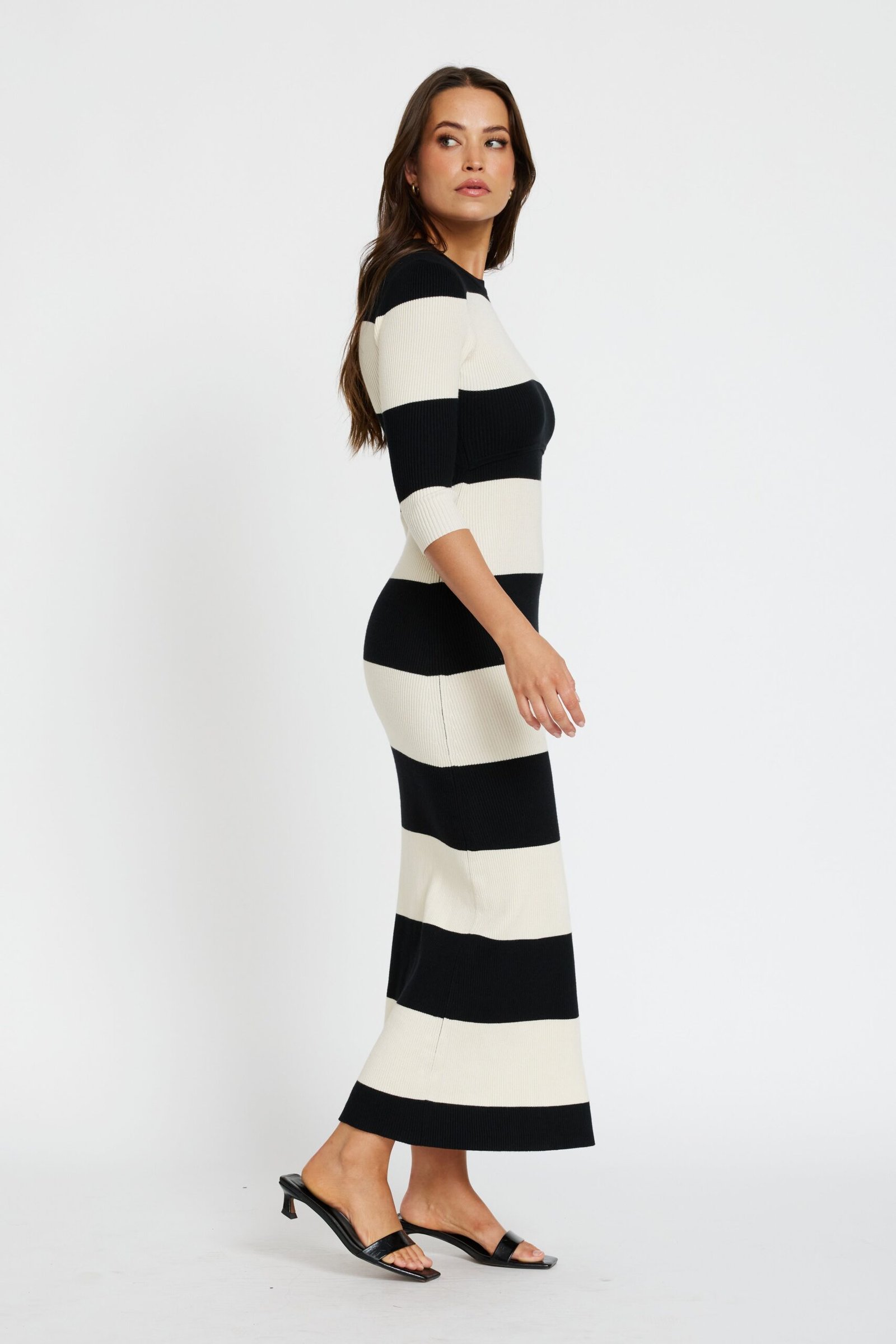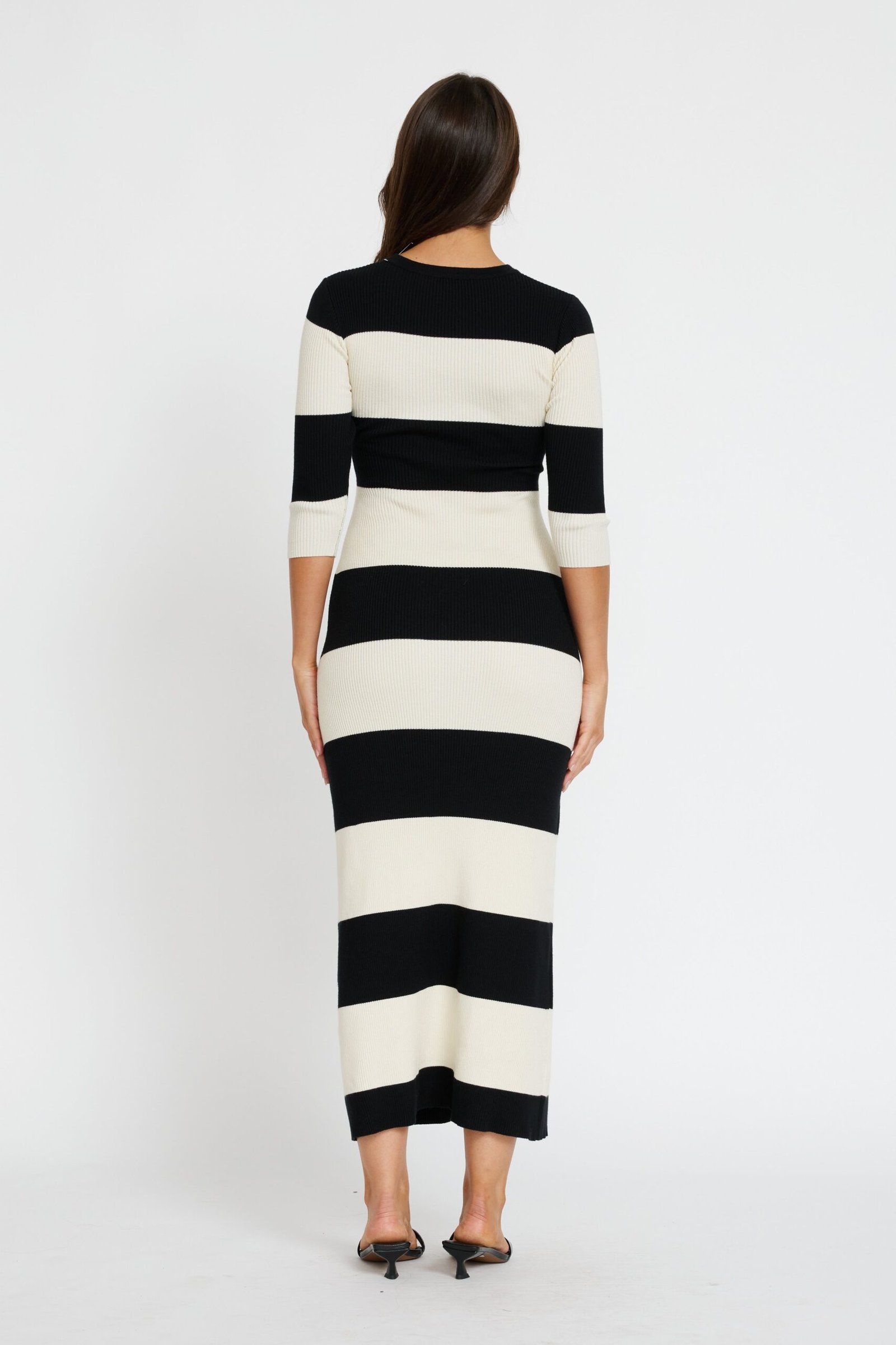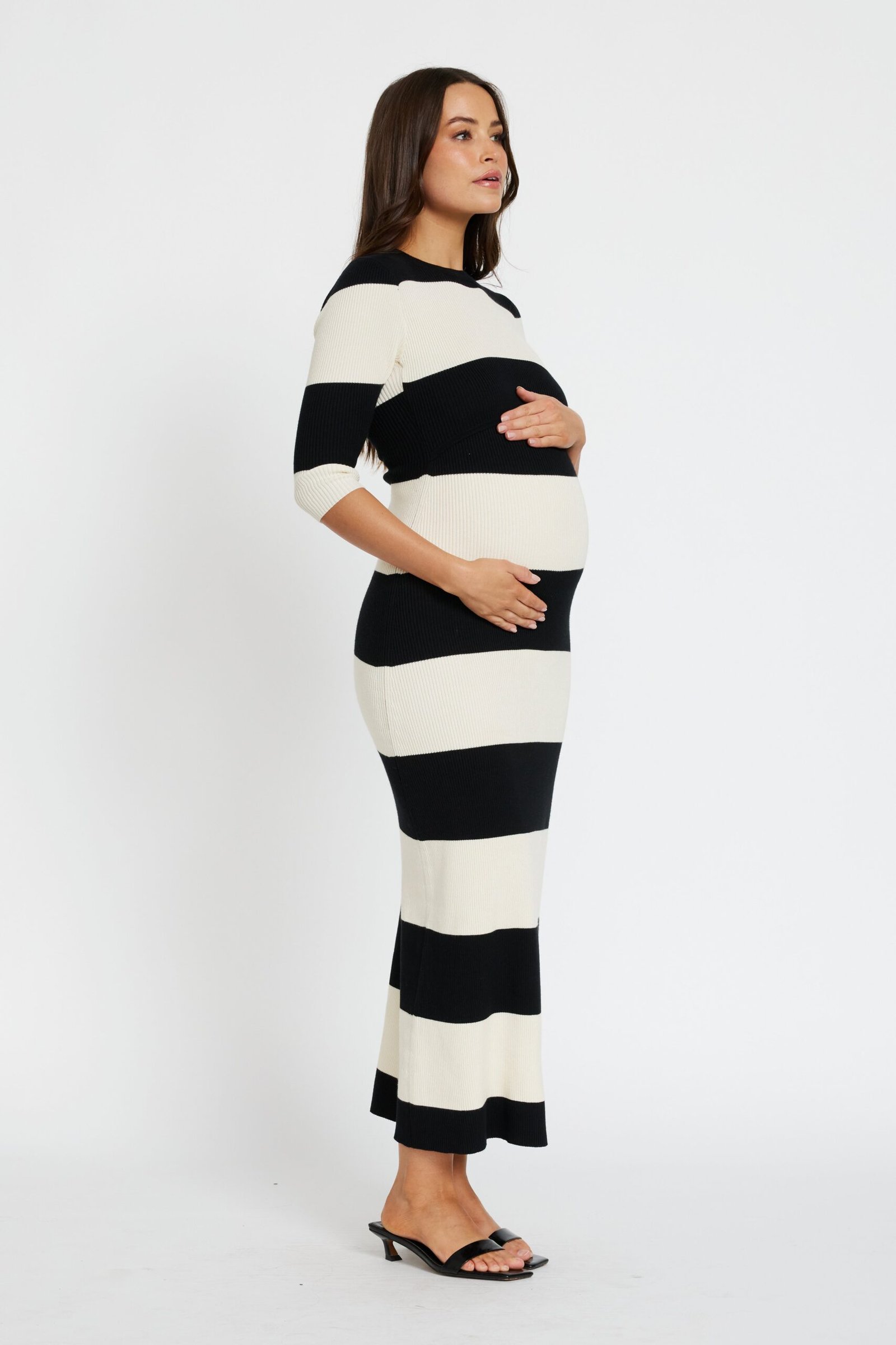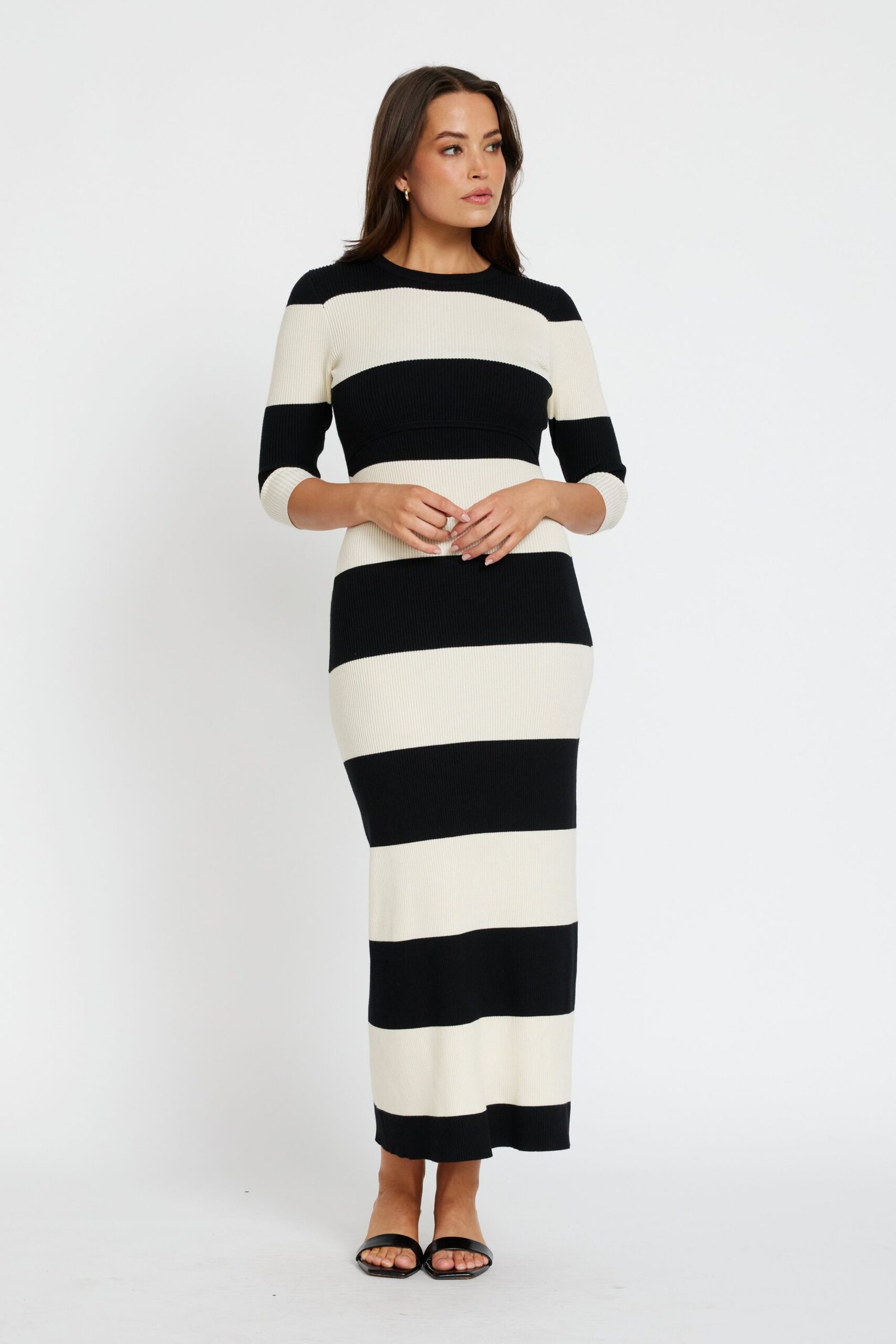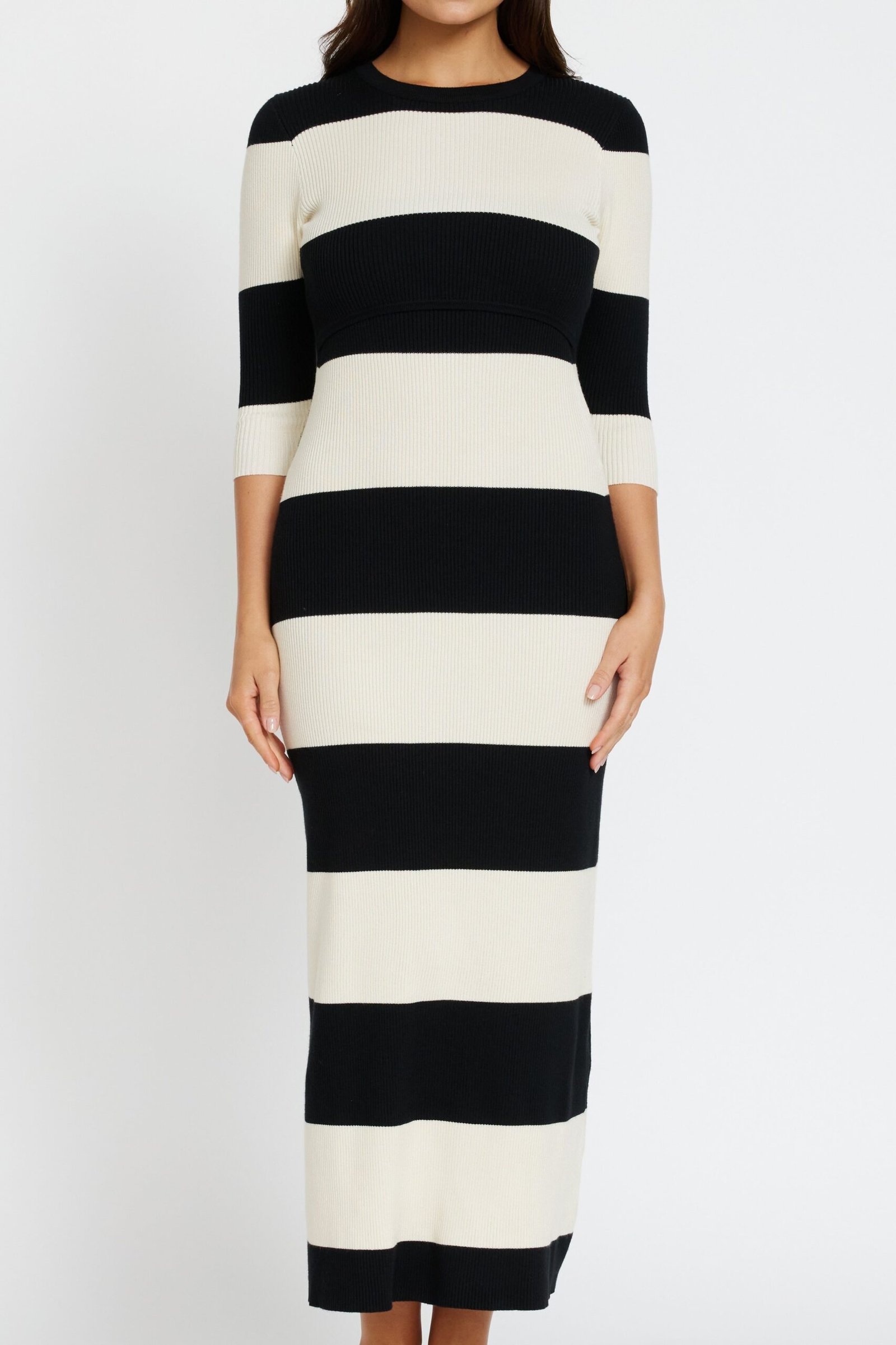 The discreet overlapping bust panels provide easy, fuss-free breastfeeding access, while the classic round neckline and elbow-length sleeves keep the silhouette polished and versatile. Finished in a timeless black and cream wide stripe pattern, this long midi-length dress is your go-to for effortless style with function built in.