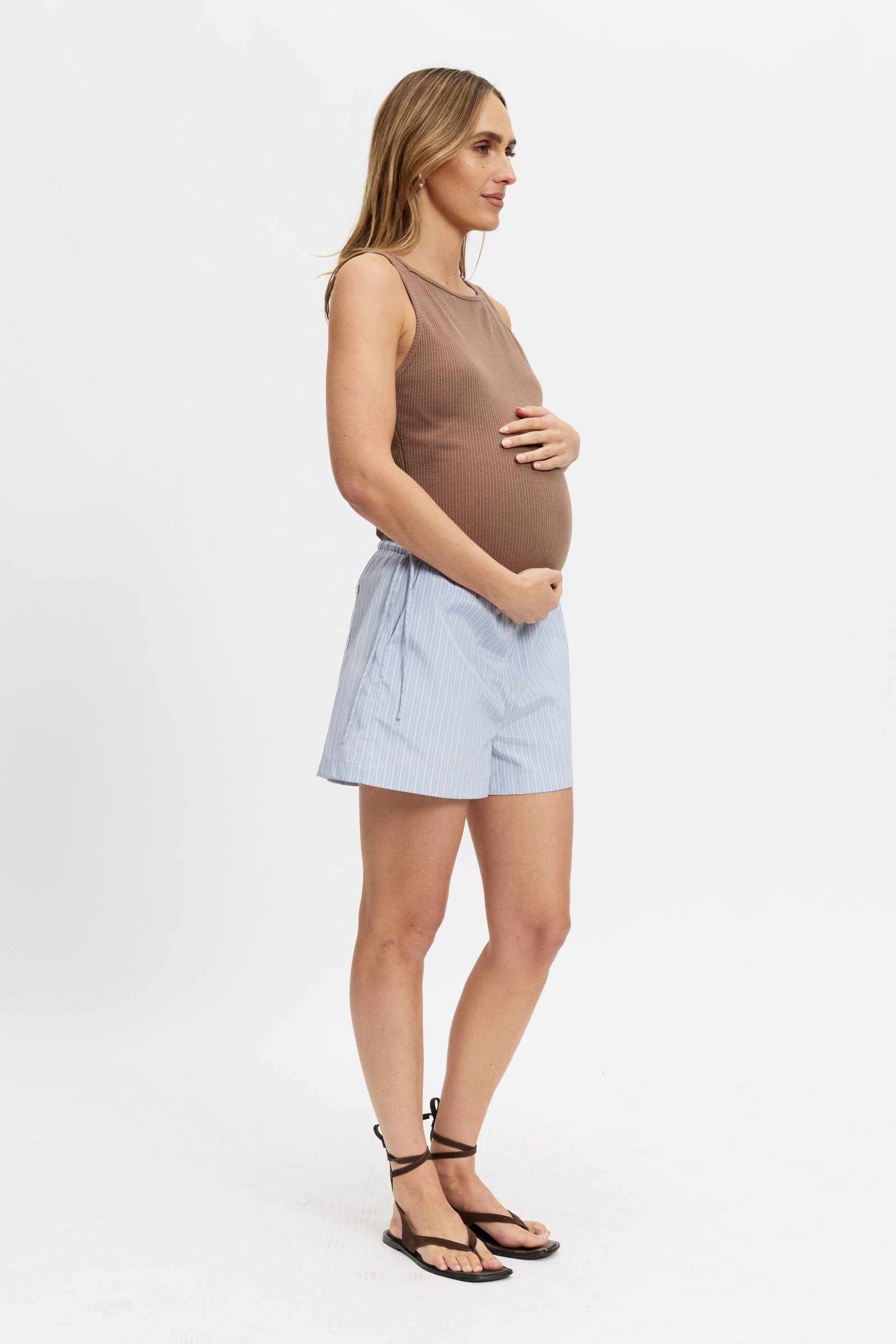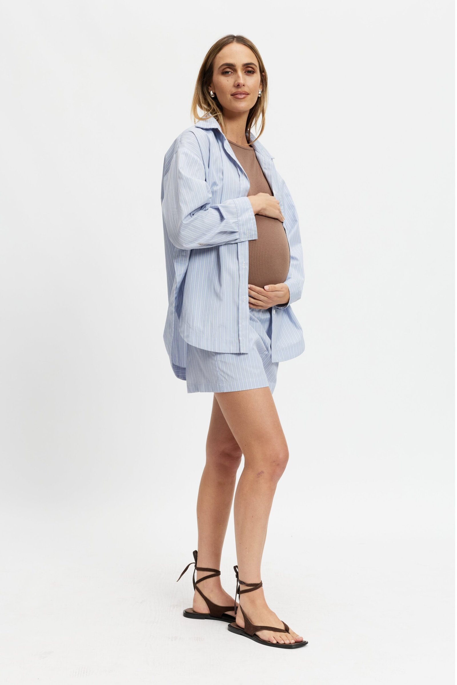 Introducing the Juliette Stripe Poplin Short in Blue Multi — a thoughtfully designed warm-weather essential that blends comfort with practicality for pregnancy and beyond.