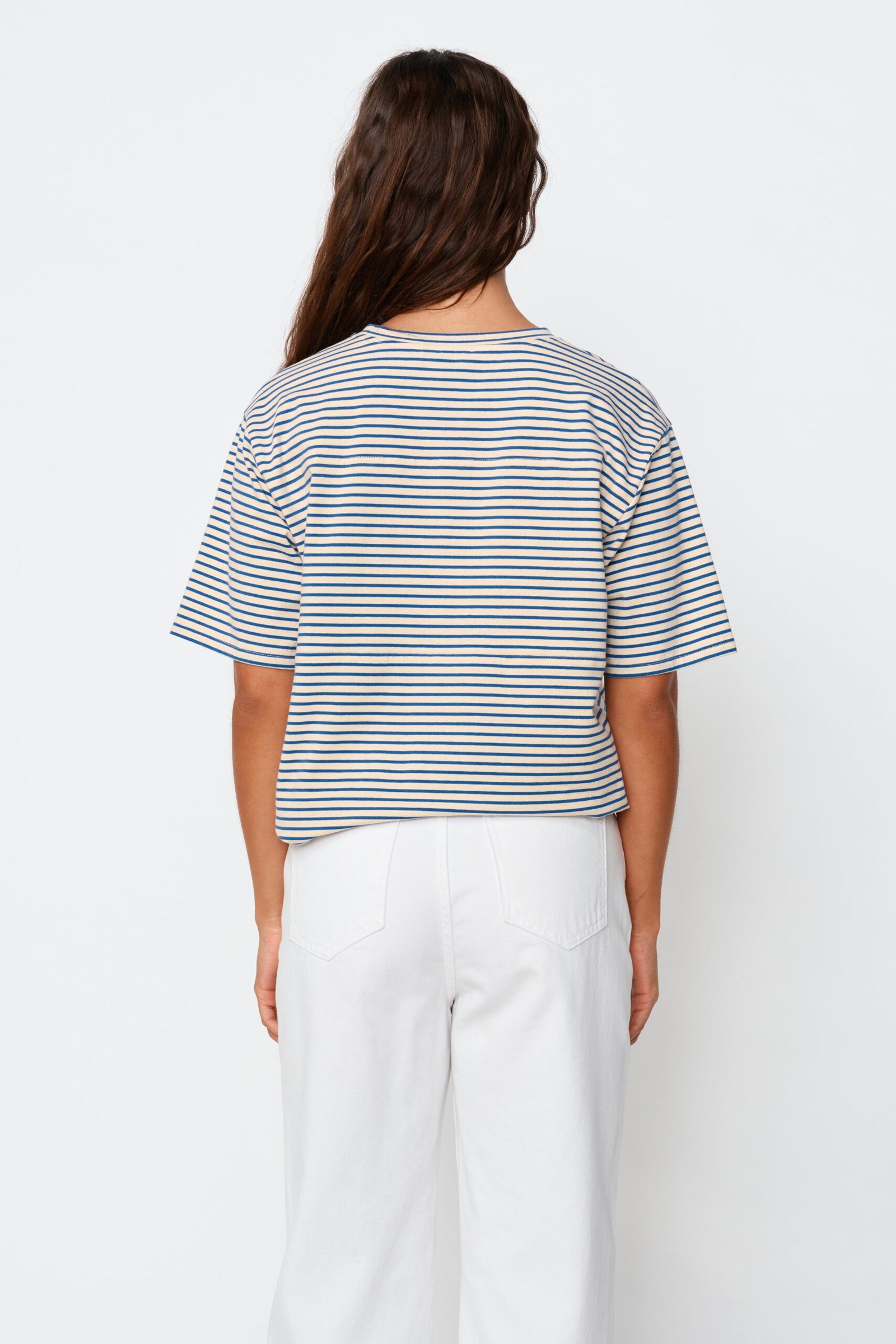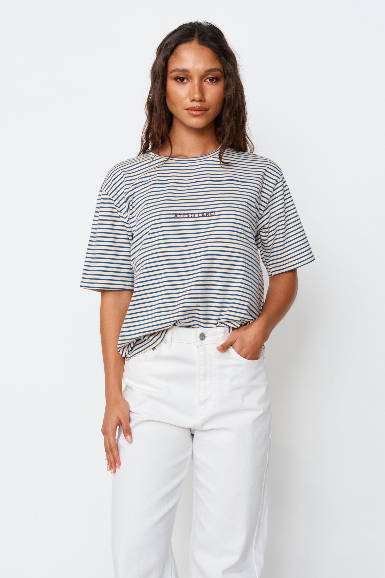 Designed with a relaxed boyfriend fit, this slip-on tee is made from soft cotton jersey and boasts a timeless cream base adorned with narrow cobalt blue stripes throughout. A touch of elegance comes from the mulberry-brown embroidered Apéro Label text on the front. With a round neckline and short sleeves, this tee is the perfect blend of comfort, practicality, and chic design.