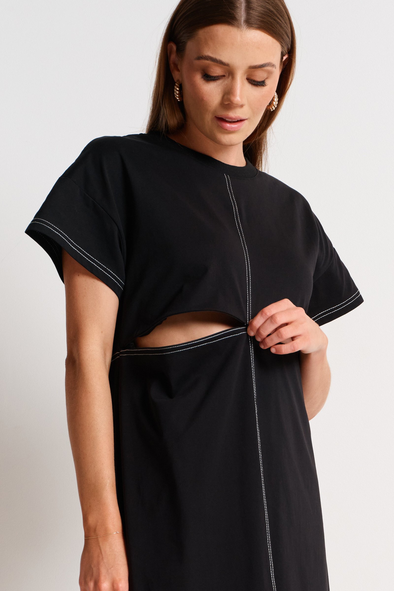 Crafted from soft, breathable jersey fabric, the Miro Contrast Panel Tee Dress is a versatile essential for your maternity wardrobe. Featuring overstitch contrast detailing and relaxed fit the Miro dress is the perfect blend of comfort and style. Enjoy fuss-free breastfeeding access via the discreet, two-way zipper under the bust.