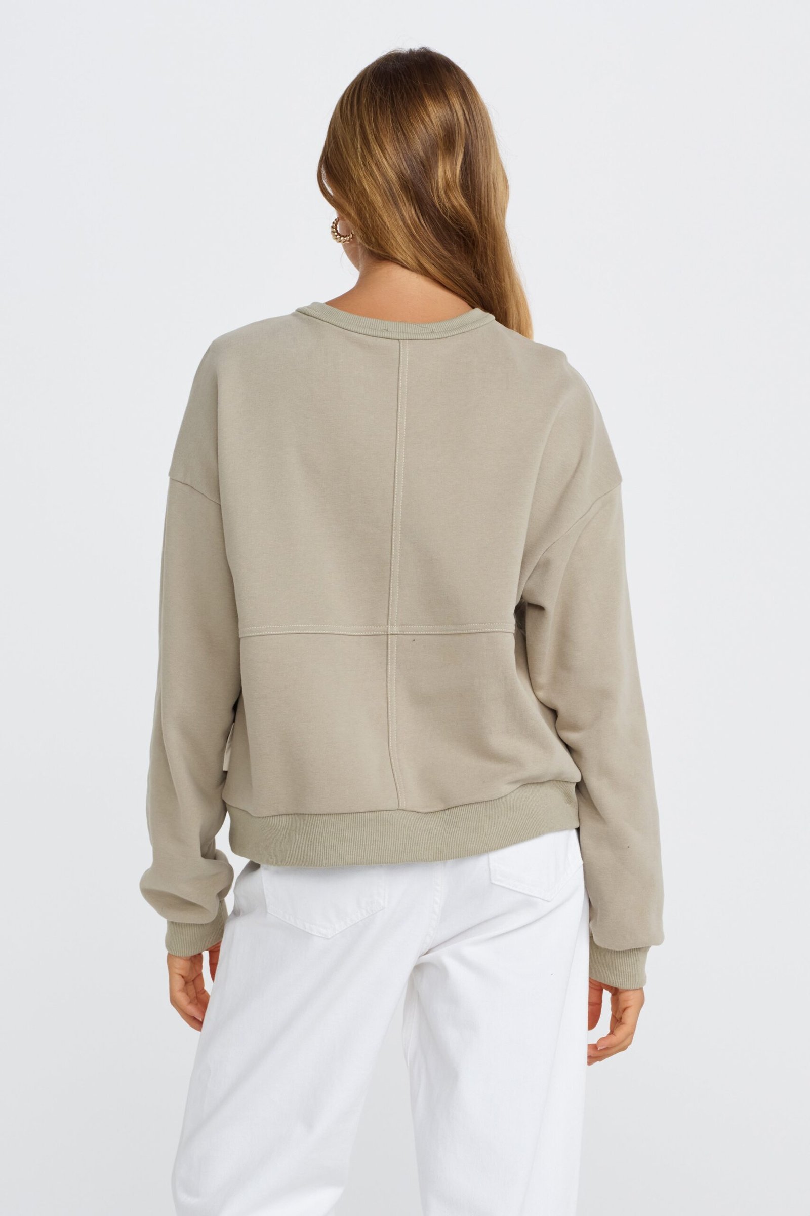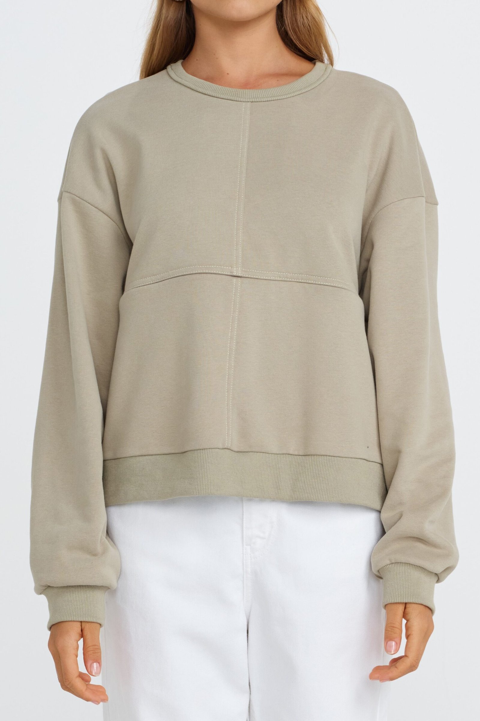 Cut in an oversized, boxy silhouette with drop-shoulder armholes, it delivers a relaxed, modern look. The soft cotton blend fleece has a subtle velour finish on the outside for a plush feel, while full-length sleeves with ribbed cuffs and a ribbed crew neckline add cosy structure. Decorative seams across the front, back, and underbust cleverly disguise the functional zipper, blending practicality with refined detailing.