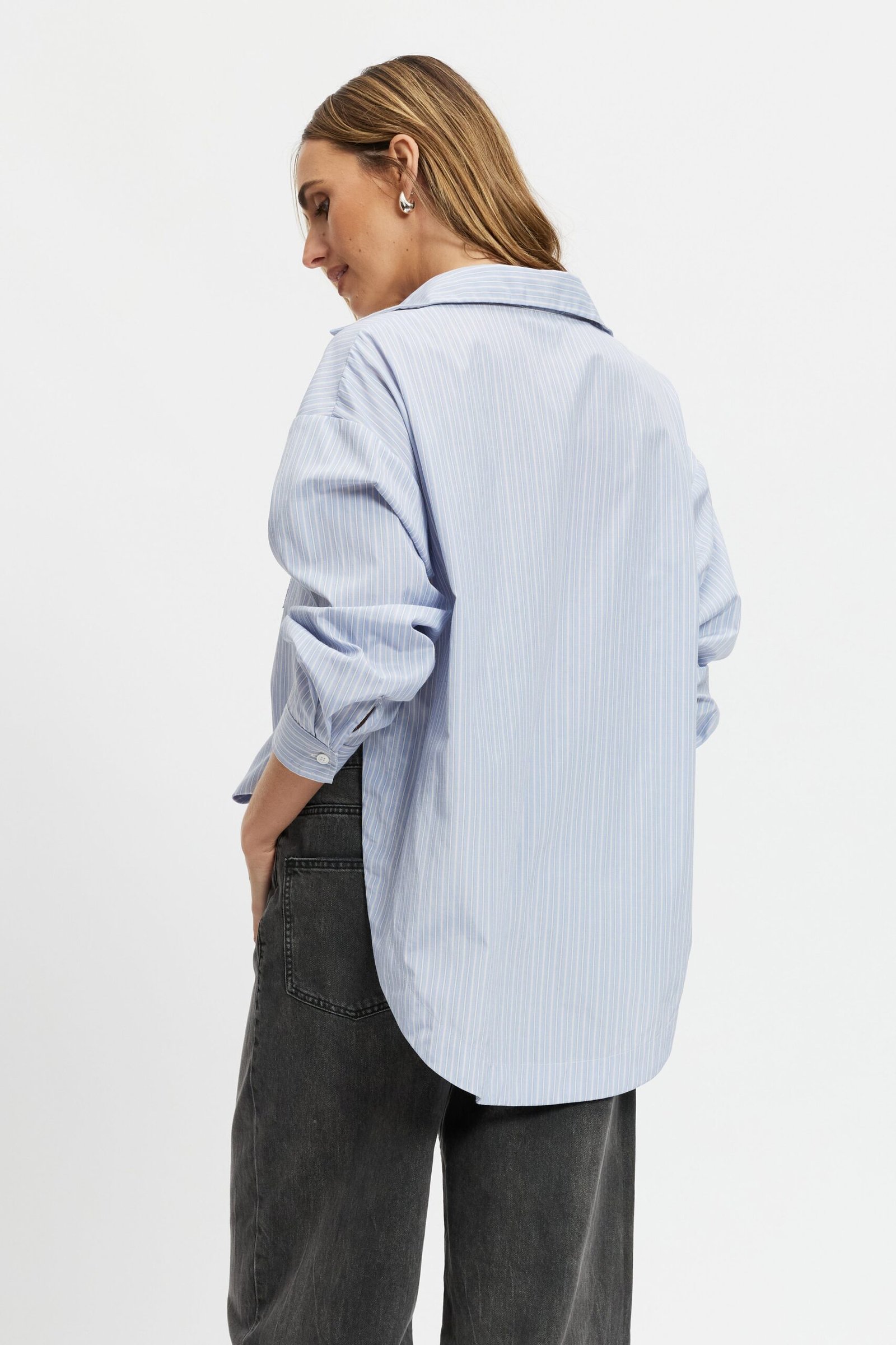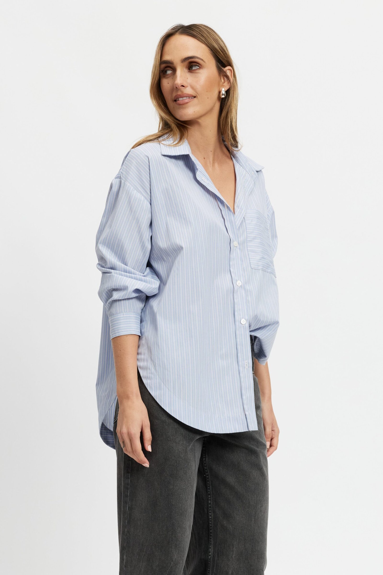 Made from durable cotton-blend poplin with a blue and white stripe, it boasts a flattering curved hem, pointed collar, button-down front, and adjustable cuffs for timeless appeal. A functional patch pocket adds practicality, while its versatile design pairs effortlessly with jeans, or tailored pants for a polished look.