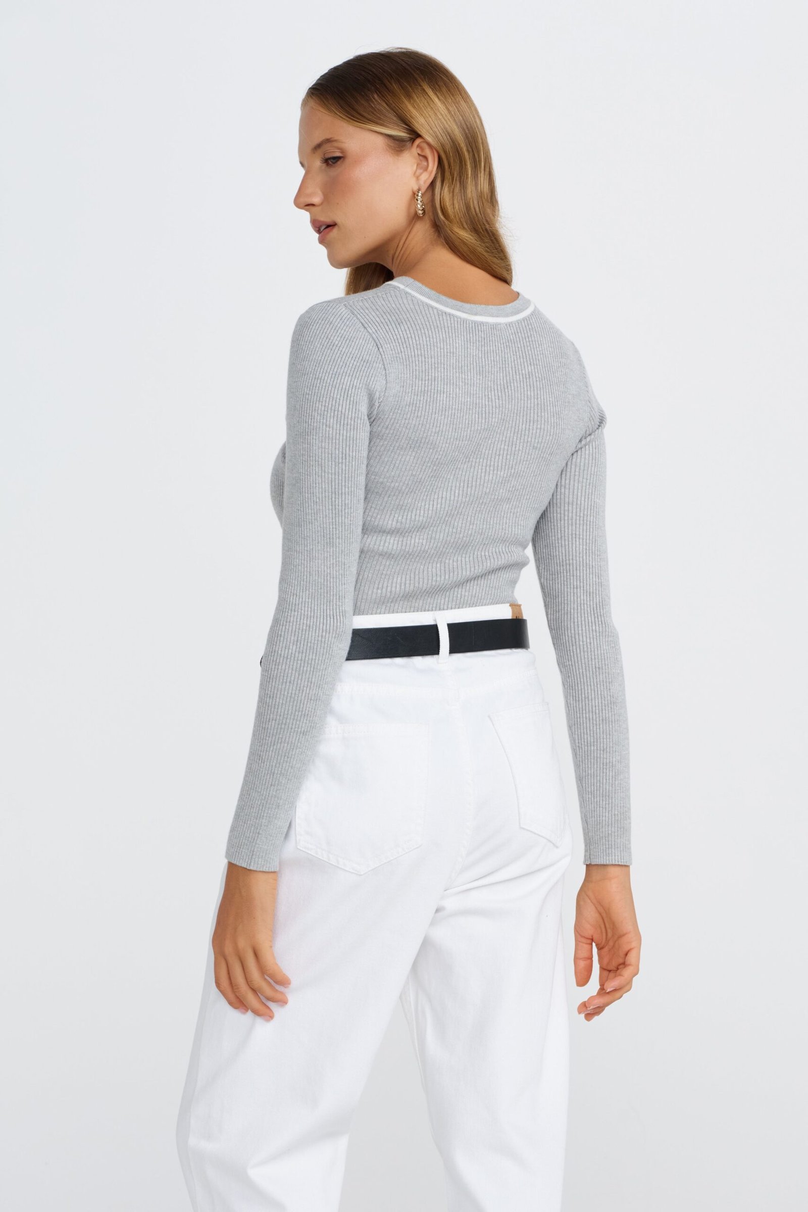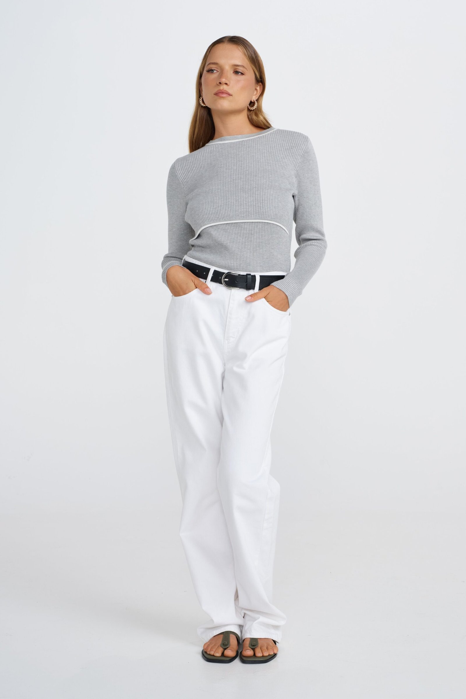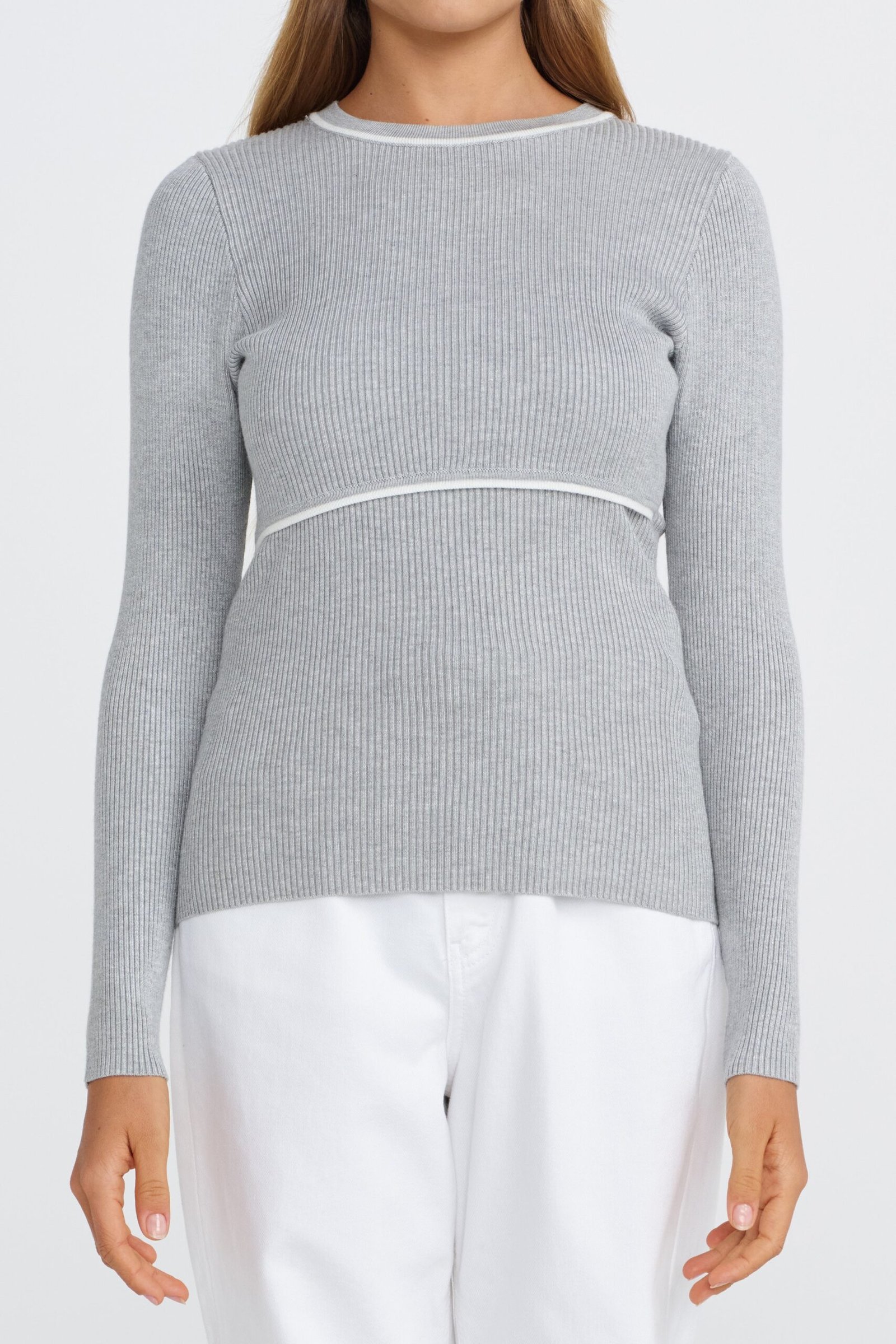 The Rowe Long Sleeve Knit Top is a maternity wardrobe essential for breast-feeding and beyond. Crafted from a stretchy, ribbed knit in a modern grey marle colour, this top is not just about comfort; it’s a style statement designed with modern mothers in mind.