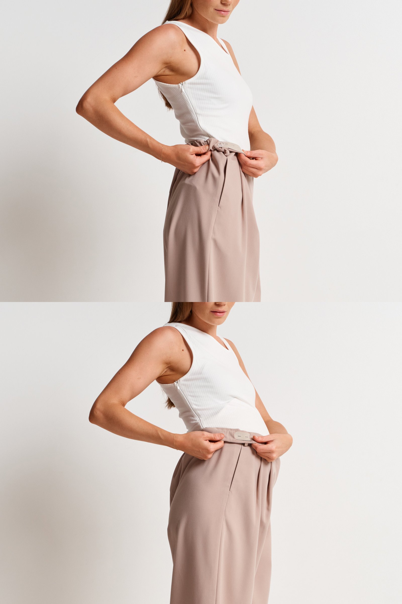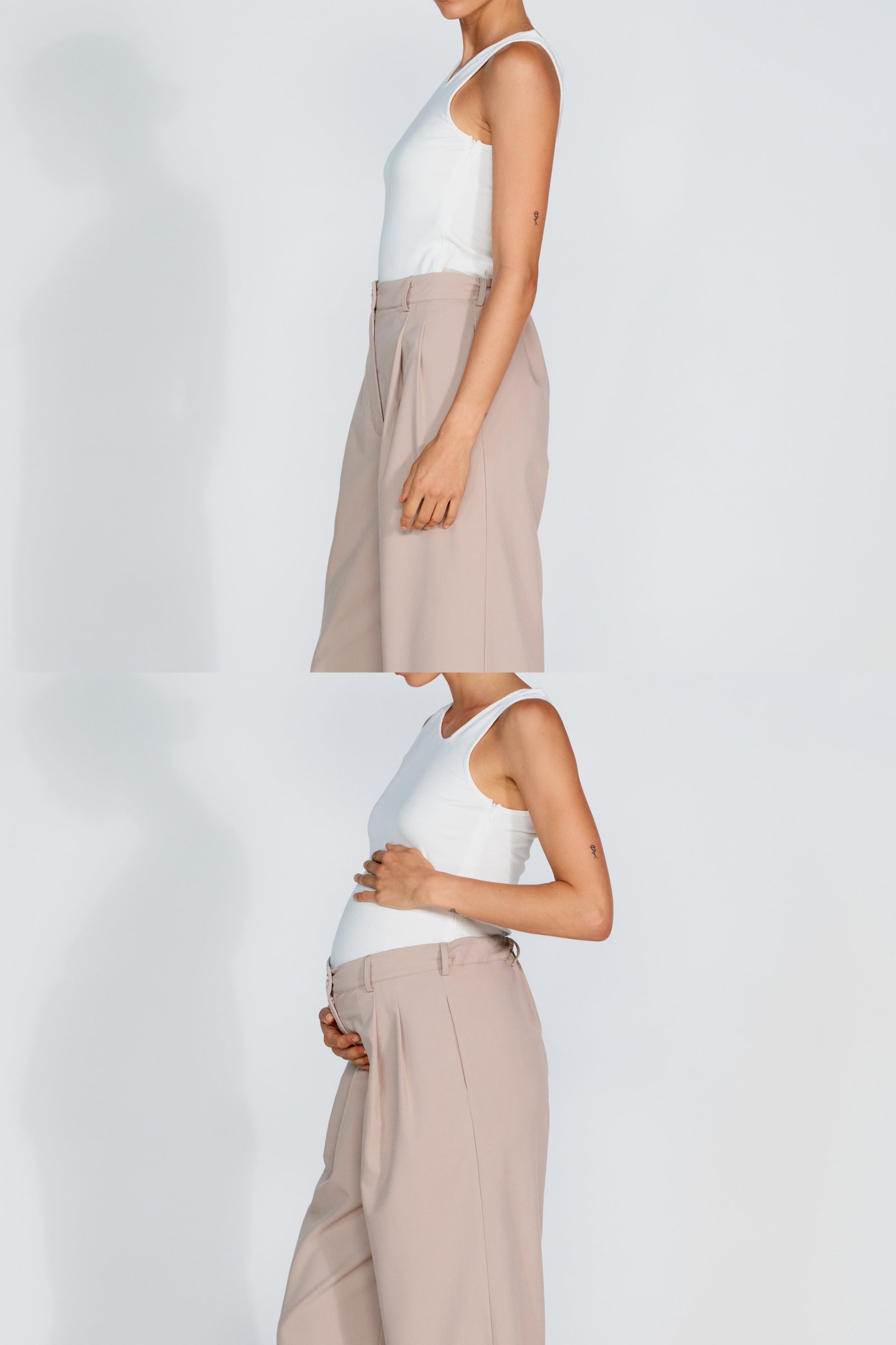 Introducing the Zadie Adjustable Wide Leg Trouser in Latte. Unlike regular maternity pants, these bottoms are designed to grow with you throughout pregnancy and beyond. Zadie was born from the belief that pregnancy shouldn’t limit style nor sacrifice wearing the pieces you love.