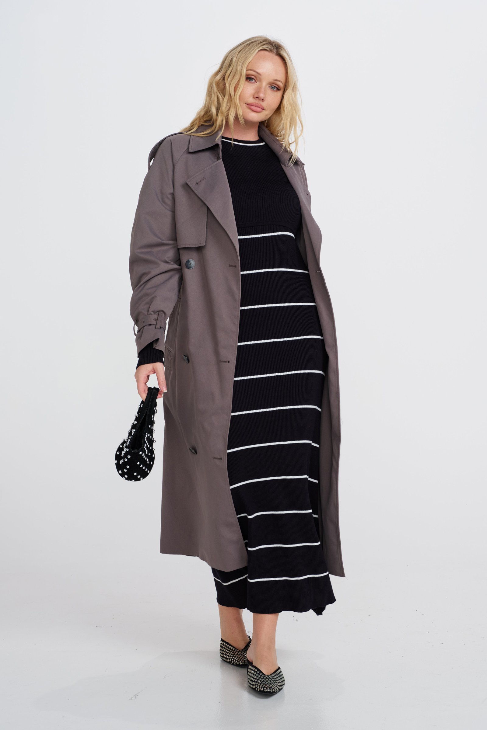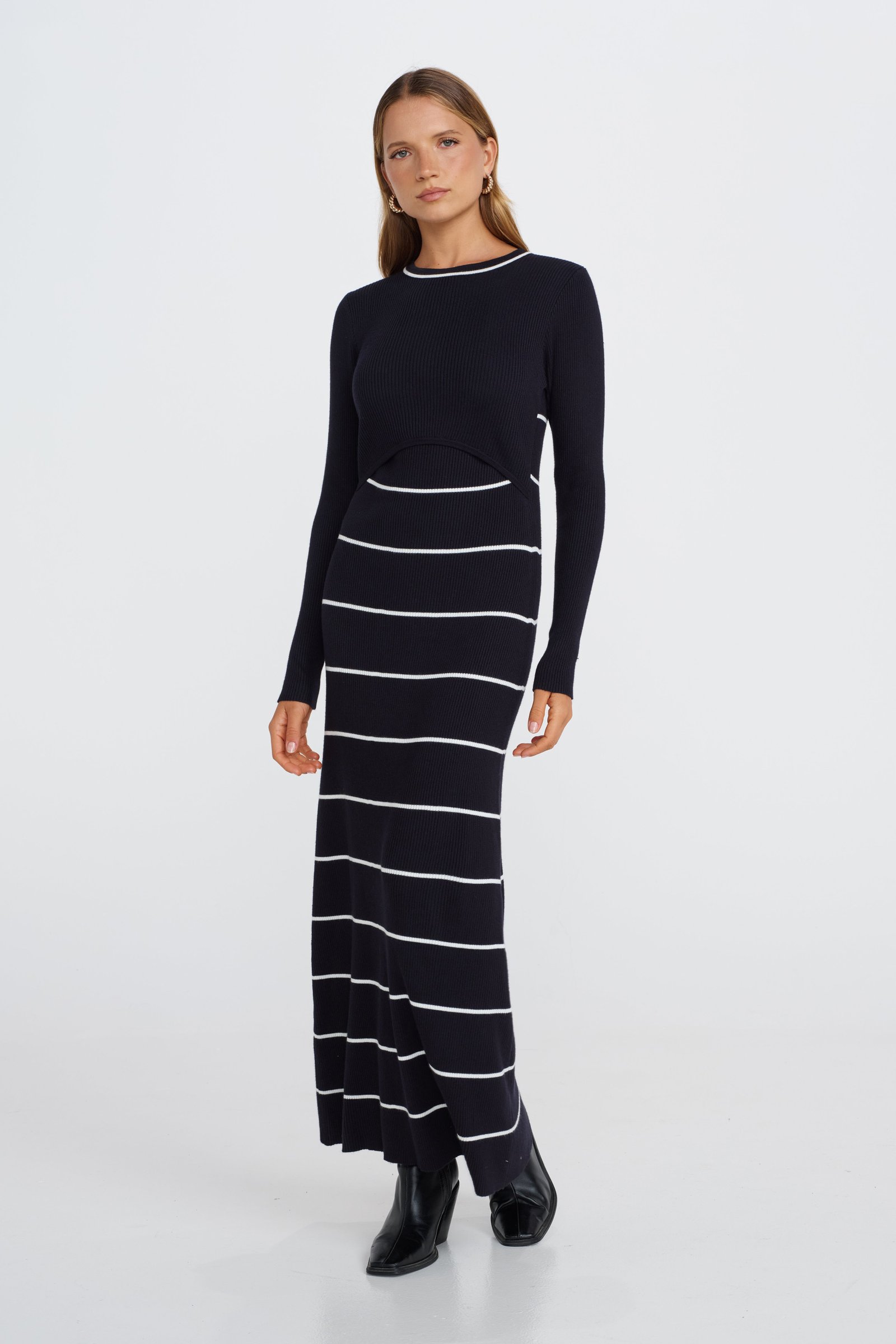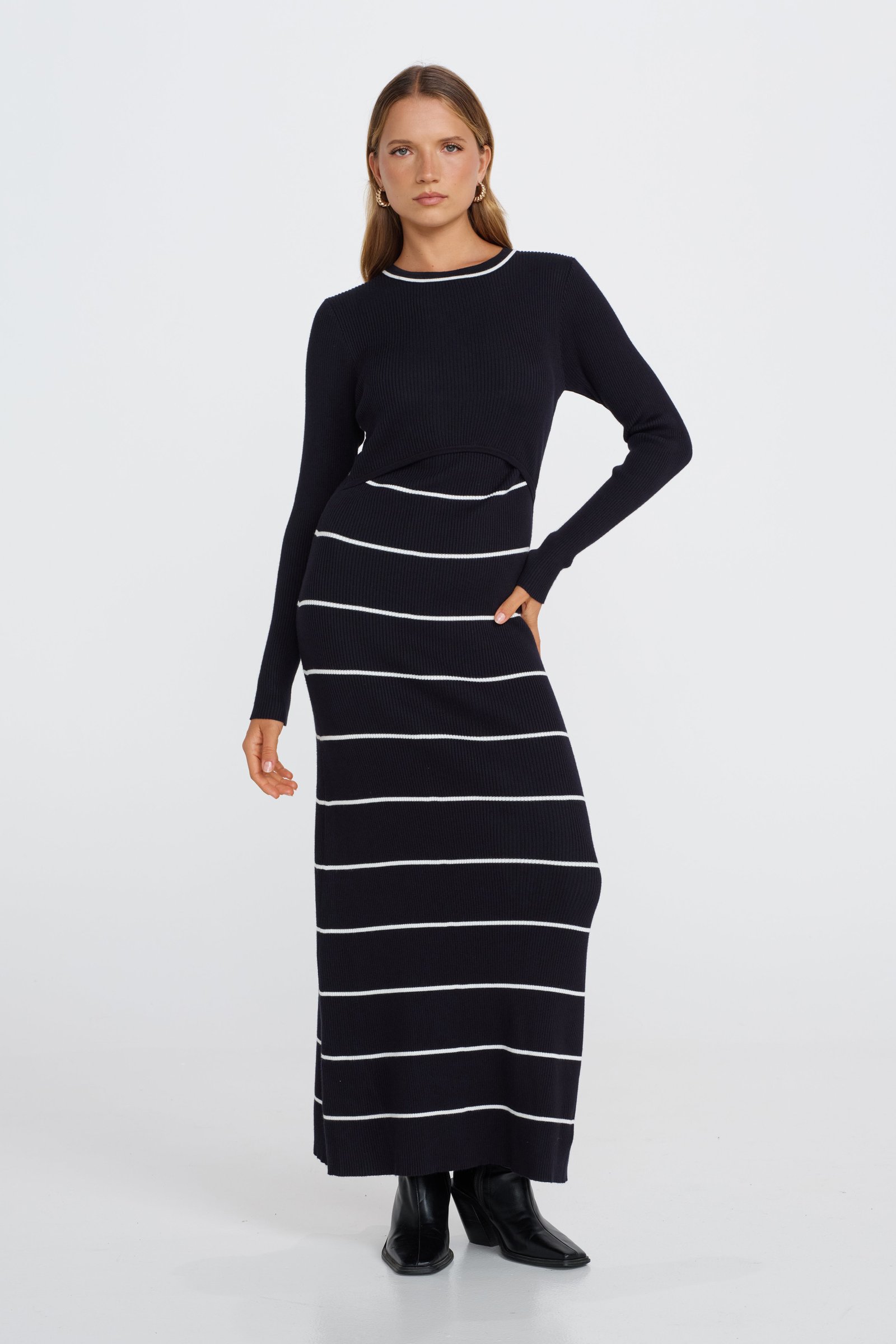 The dress features overlapping panels at the front bust, allowing for discreet and easy access for breastfeeding, making it both stylish and functional. A subtle white contrast trim around the neckline adds a chic touch, while the narrow white stripe pattern down the front and back bodice gives the dress a modern, streamlined look.