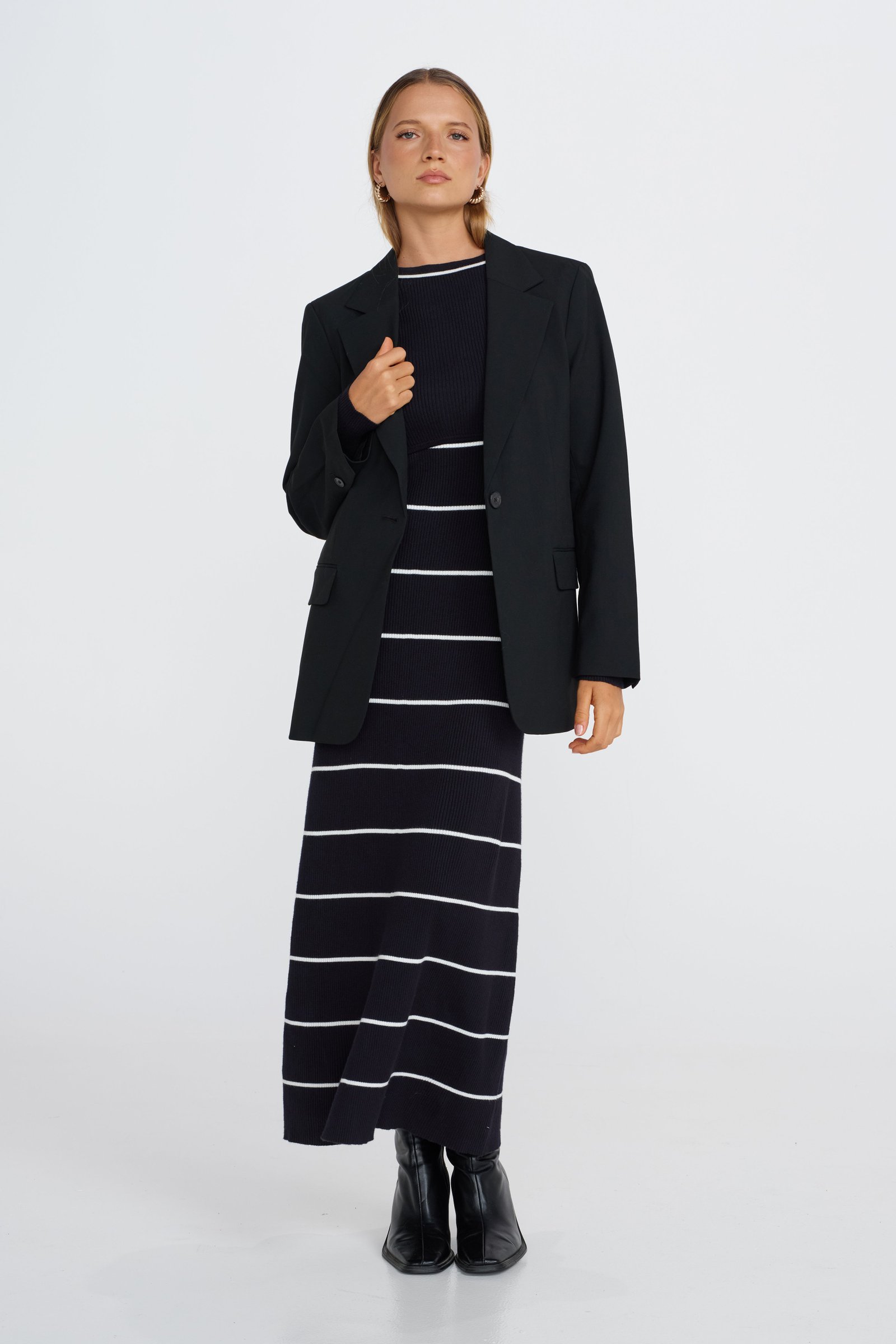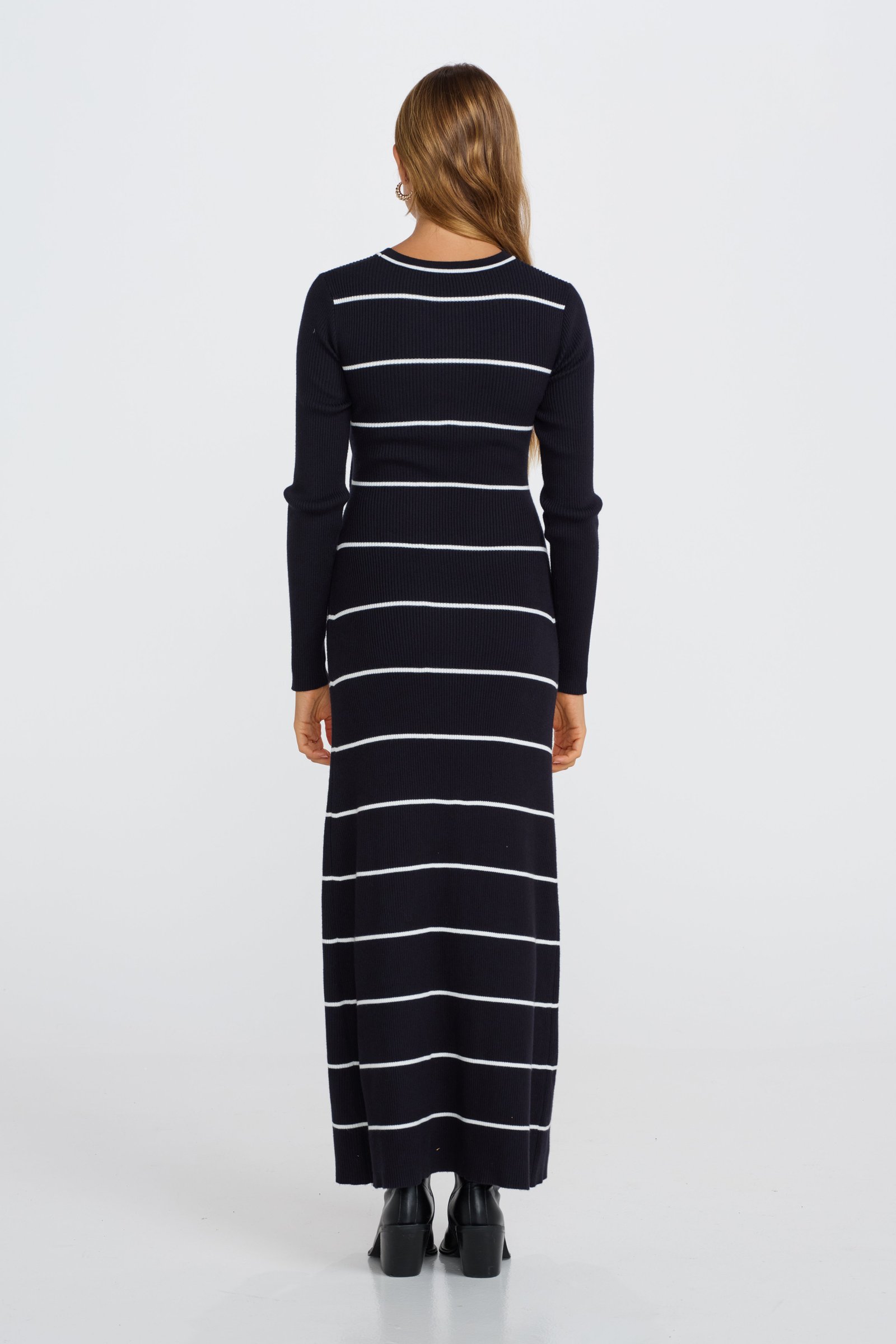 The Zoe Knit Long Sleeve Dress in Navy / White is the perfect blend of style, comfort, and practicality for mothers. Crafted from a stretchy, ribbed knit in a deep navy shade, this dress is bump-friendly and designed to fit comfortably over your growing belly while providing a flattering close body fit.